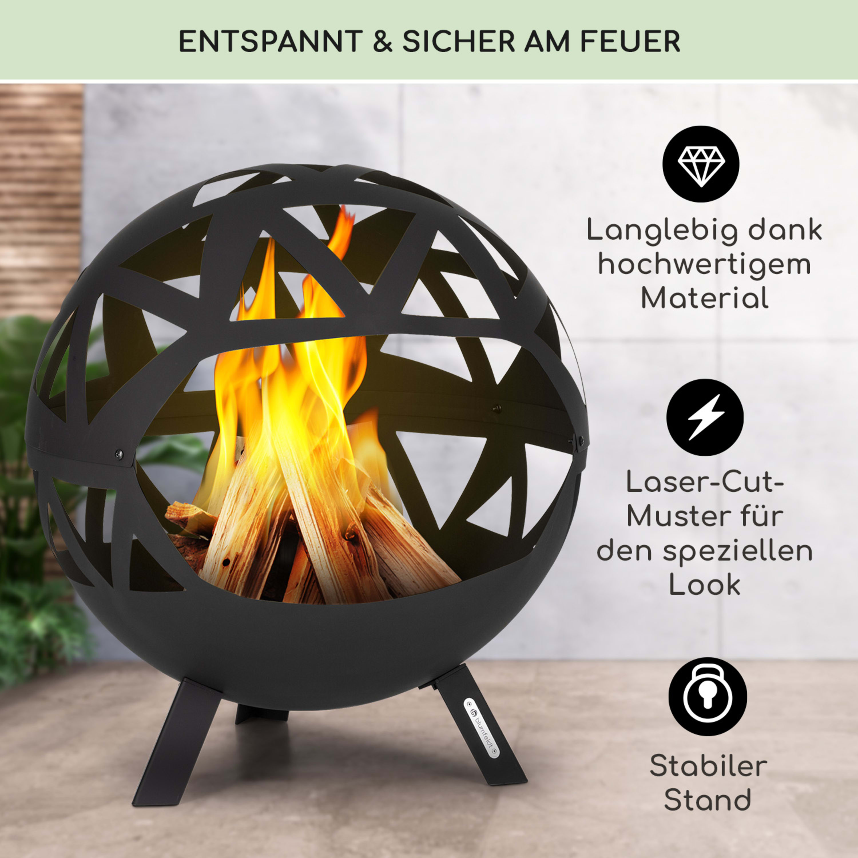 Erlebe gemütliche Lagerfeuerstimmung mit Blick auf die wärmenden Flammen: Die Feuerstelle in Form einer großen Kugel versprüht eine atemberaubende Atmosphäre, wenn du das züngelnde Flammenspiel durch die geometrischen Aussparungen beobachtest. So ist dein Feuer windgeschützt, du kannst es jedoch durch die vordere Öffnung ideal schüren oder löschen. Mit seiner 1,2 mm starken Stahlwand ist die Colima Feuerschale von blumfeldt sehr robust und steht sicher auf dem erhöhten Dreifuß. Dadurch ist auch der Untergrund, wie Rasen oder Terrassenboden, optimal vor Hitze geschützt. Für langlebige Freude schützt eine Regenhaube deine neue Feuerschale vor Wind und Wetter. Dank dem mitgeliefertem Schürhaken, dem Holzkohlerost und der Aschepfanne ist es ein Leichtes, das Feuer für erholsame Abendstunden zu schüren.