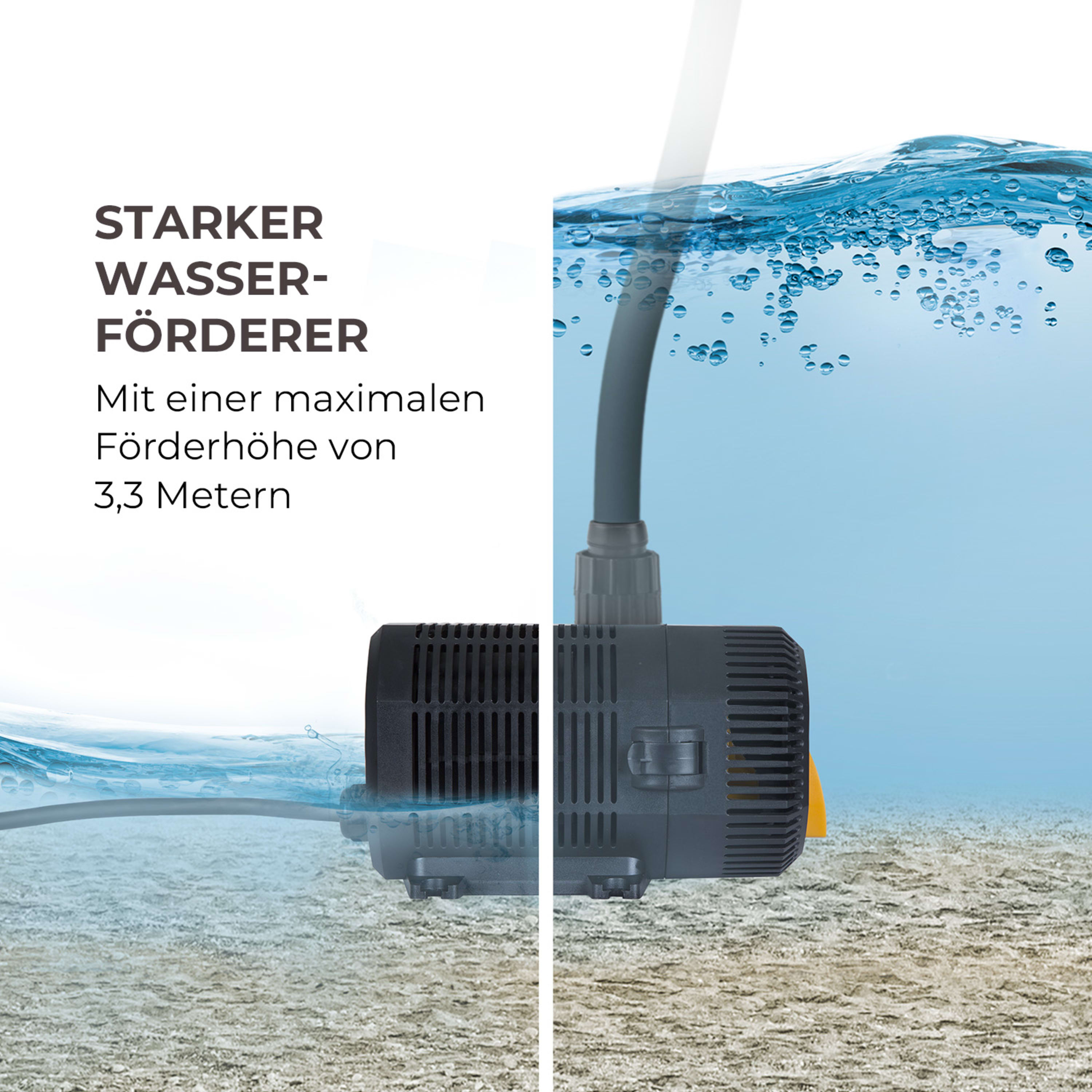 Die Pumpe verrichtet ihre Arbeit hervorragend und das mitgelieferte Netzkabel ist sehr lang. Nur 4 Sterne, da die Durchflussmengenverstellung mechanisch erfolgt, man kann zwar die Durchflussmenge regulieren, spart aber keinen Strom. Schade ist auch, dass es kein Zubehör gibt, mit dem man die Pumpe auch als Wasserspiel nutzen kann