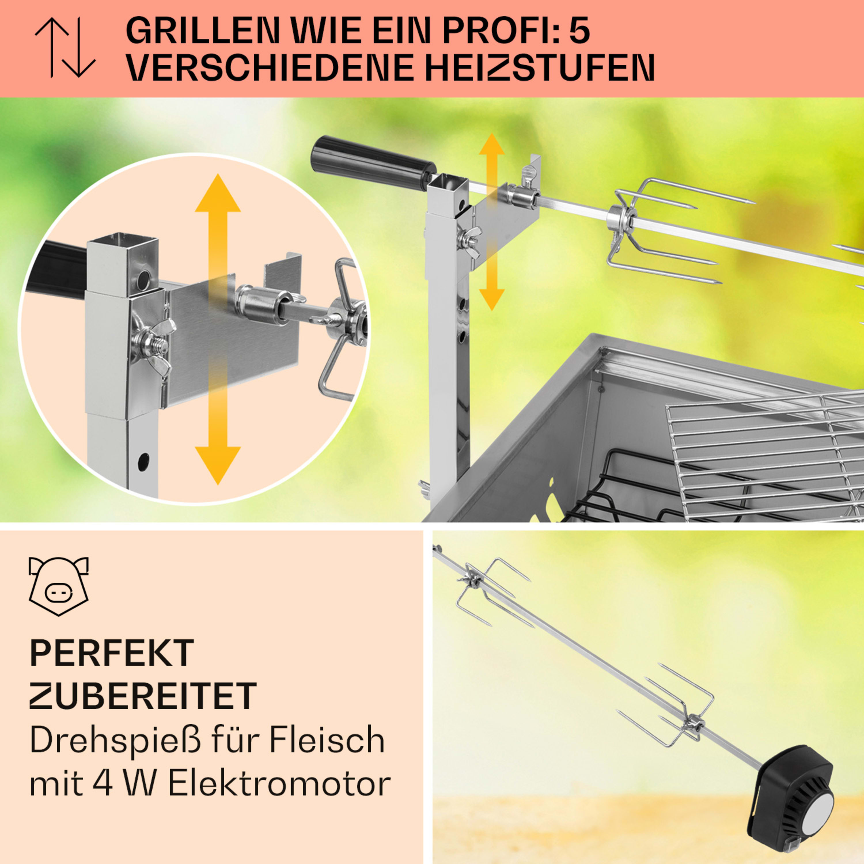 Angetrieben wird der Edelstahl-Spieß des Rotisserie-Grills von einem mitgelieferten Motor mit 4 Watt Leistung: Durch eine stetige Drehung sorgt er für einen gleichmäßigen Garprozess und perfekt-saftigen Fleischgenuss. Dabei fasst die Grillwanne genügend Kohle, um über lange Zeit die notwendige Hitze zu liefern. Dank des großen Grillrosts aus Edelstahl steht außerdem eine großzügige Grillfläche bereit, die den Grill auch zum perfekten Partner für traditionelle BBQ-Events macht. Dass neue Standbein-Design verleiht dem Grill darüber hinaus noch besseren Halt auf unterschiedlichen Terrains.