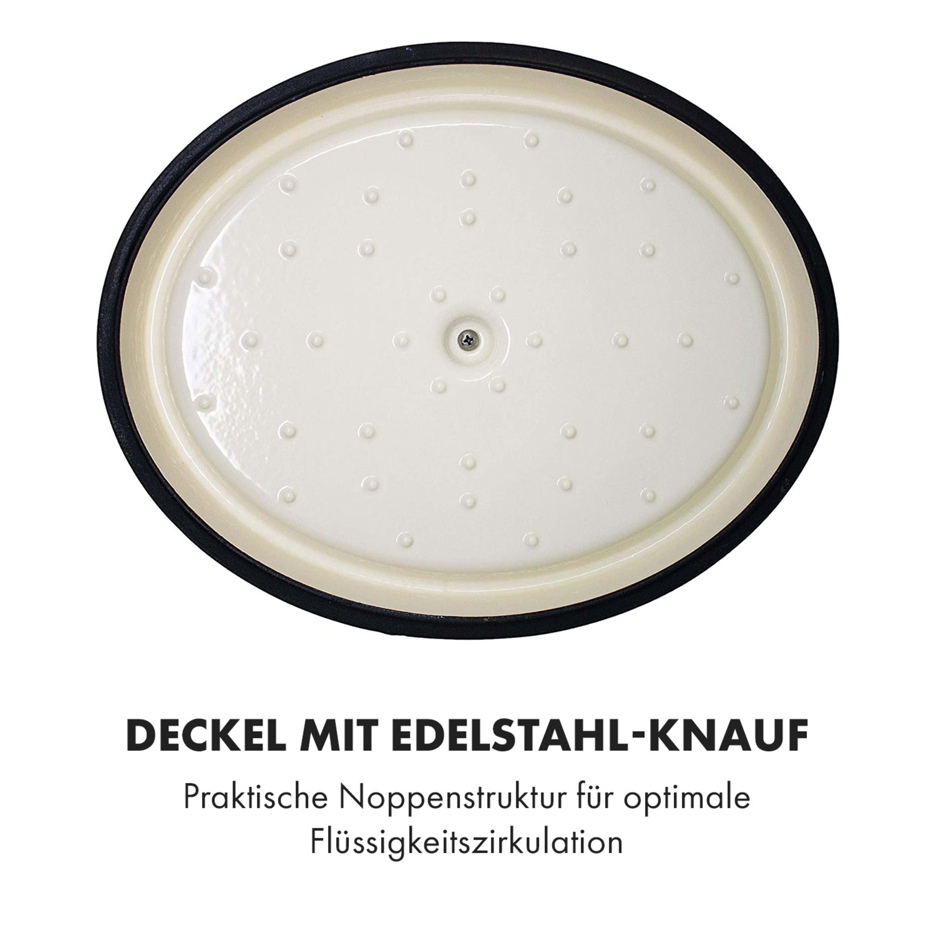 Der Topf ist oval, 4l Fassungsvermögen. Gut emailliert. Dass es sich um Gusseisen handelt, erkennt man sofort am Gewicht. Der Deckel ist zudem sehr schwer, was ein perfektes Garen, insbesondere langes Garen, erleichtert. Darüber hinaus ermöglicht das Material eine große Vielseitigkeit. Ich habe es zuerst auf dem Herd gekocht und dann in den Ofen geschoben. Ich kann es auf jeden Fall empfehlen