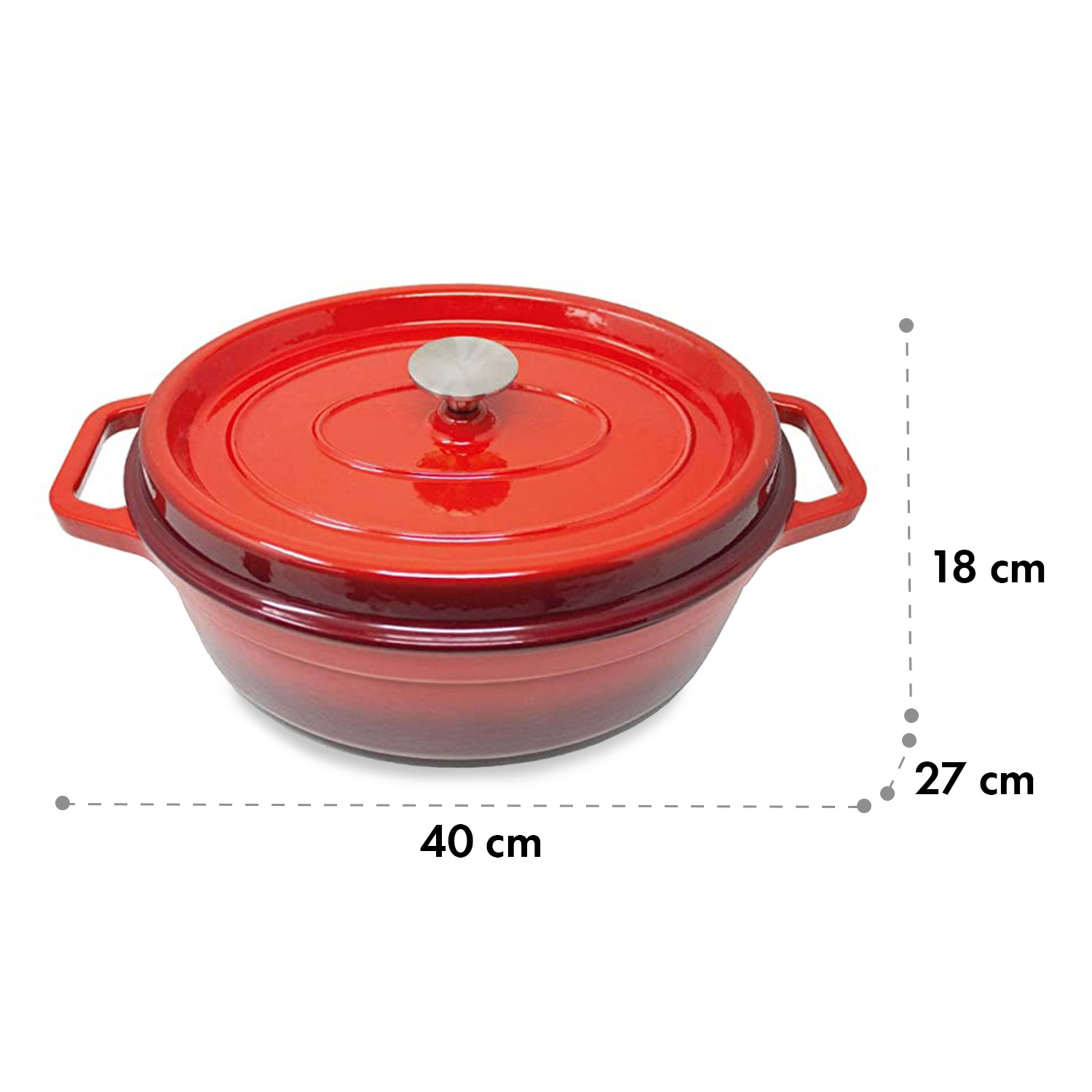 La pentola é ovale, 4l di capacità. Ben smaltata. Si capisce subito che é tutta ghisa dal peso. Anche il coperchio é molto pesante, il che facilita una cottura perfetta, soprattutto la lunga cottura. Inoltre, il materiale, permette una grande versatilità. Io ho cotto prima su fuoco e poi ho messo in forno. La consiglio sicuramente