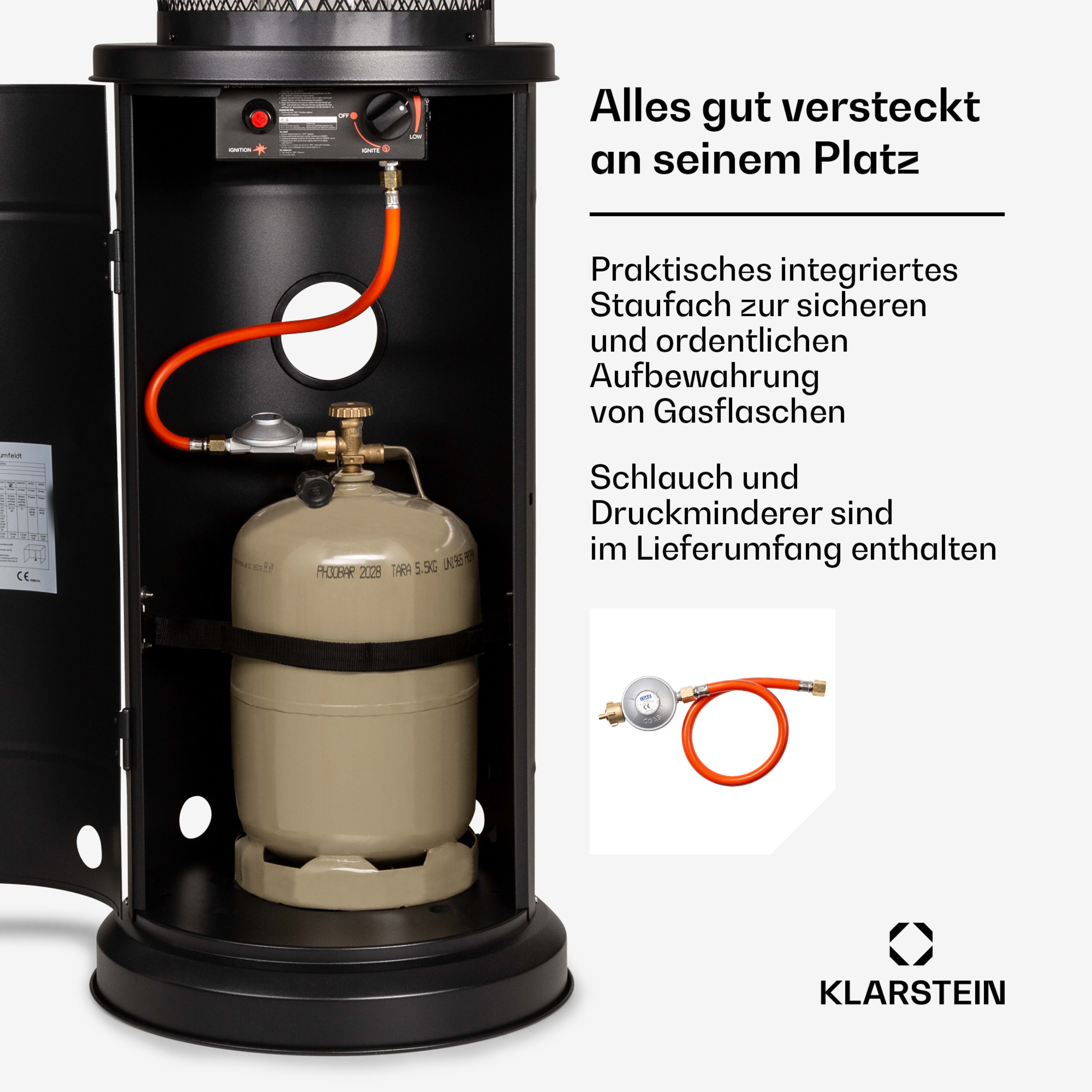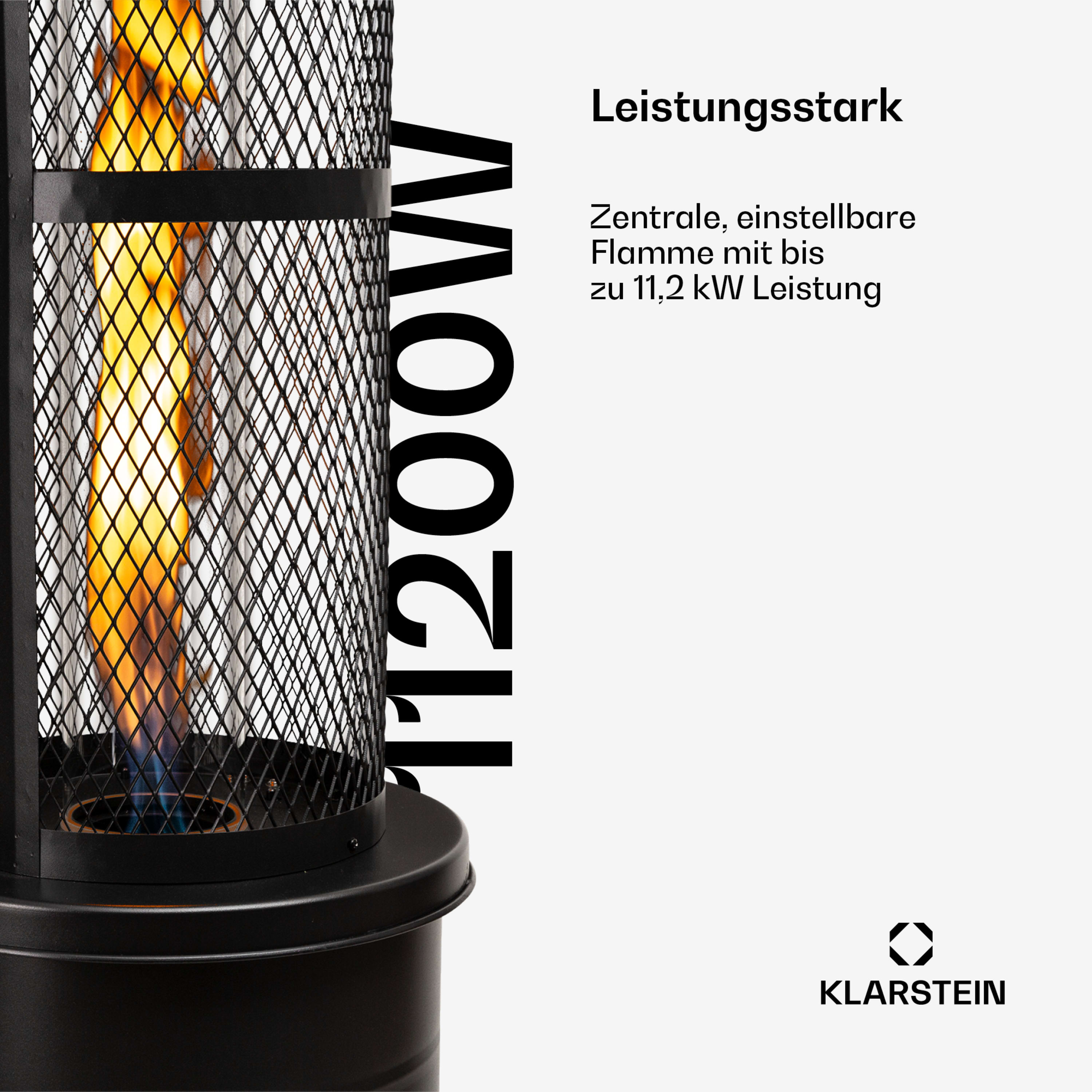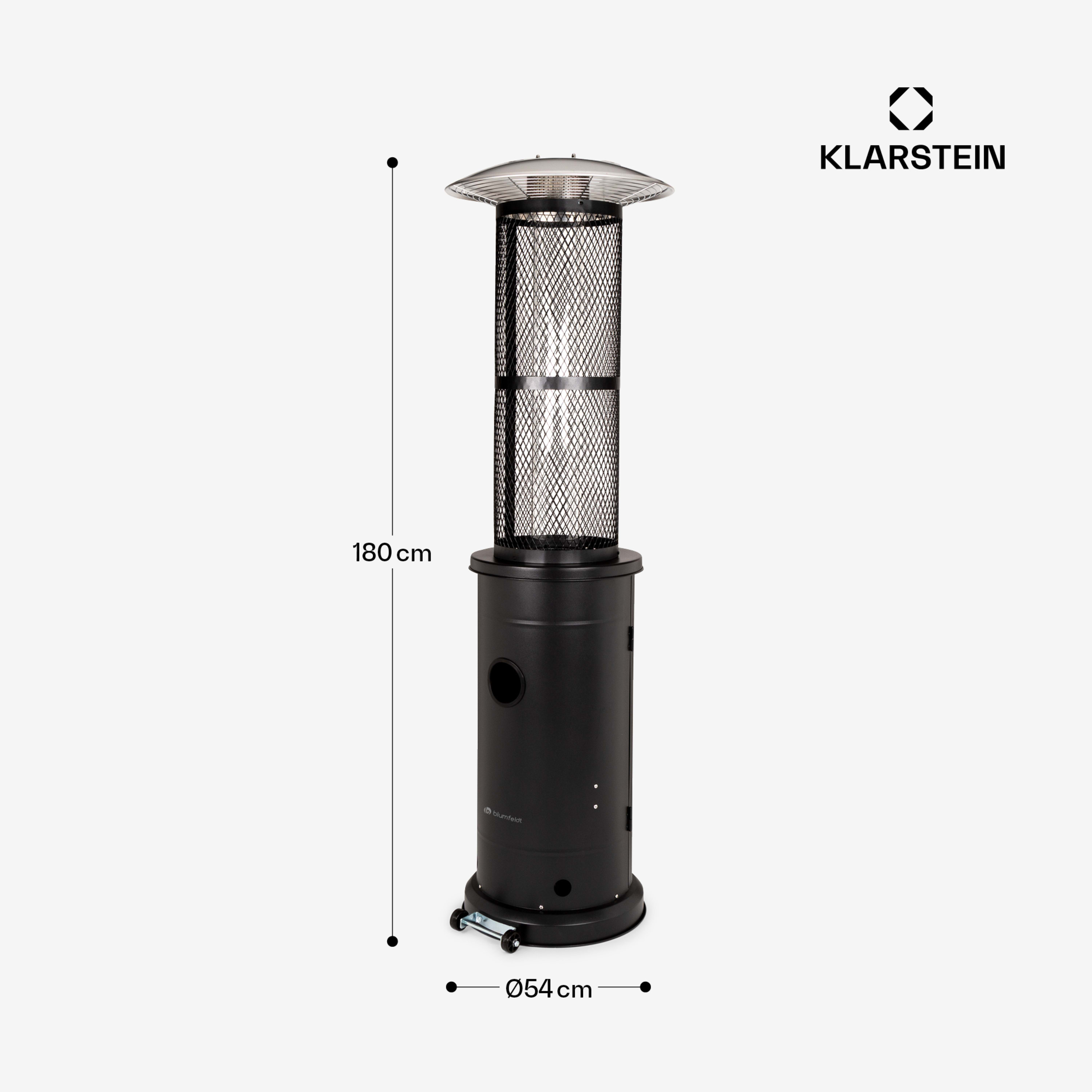 Leistungsstark und energieeffizient. Der Goldflame Heizpilz ist zur Verwendung mit 11 kg Propan- oder Butangefüllten Flüssiggasflaschen geeignet, die ganz einfach und sicher im geräumigen Innenraum Platz finden. Entfacht wird das Gerät unkompliziert über eine integrierte Elektrozündung. Ein mehrstufiger Regler kontrolliert die Zufuhr des Gases und damit die Heizleistung. Die Gasheizung erzeugt bis zu 11,2 kW Wärmeleistung bei einem Gasdurchfluss von 815 g/h. Der extragroße Reflektorschirm von 54 cm Durchmesser sorgt dafür, dass die Wärme nicht nach oben entweicht, sondern auf die Umgebung verteilt wird. Damit versorgt er den Aufstellort sowie die Personen im näheren Umkreis schnell und effektiv mit angenehm wohliger Strahlungswärme. Besonders eindrucksvoll im Betrieb ist der Brennerzylinder aus bruchfestem Borosilikatglas. Von heißer Luft durchströmt, brennt in ihm die Gasflamme wie eine Fackel und sorgt mit 360° FireView für ein beeindruckendes, ungefährliches Schauspiel.