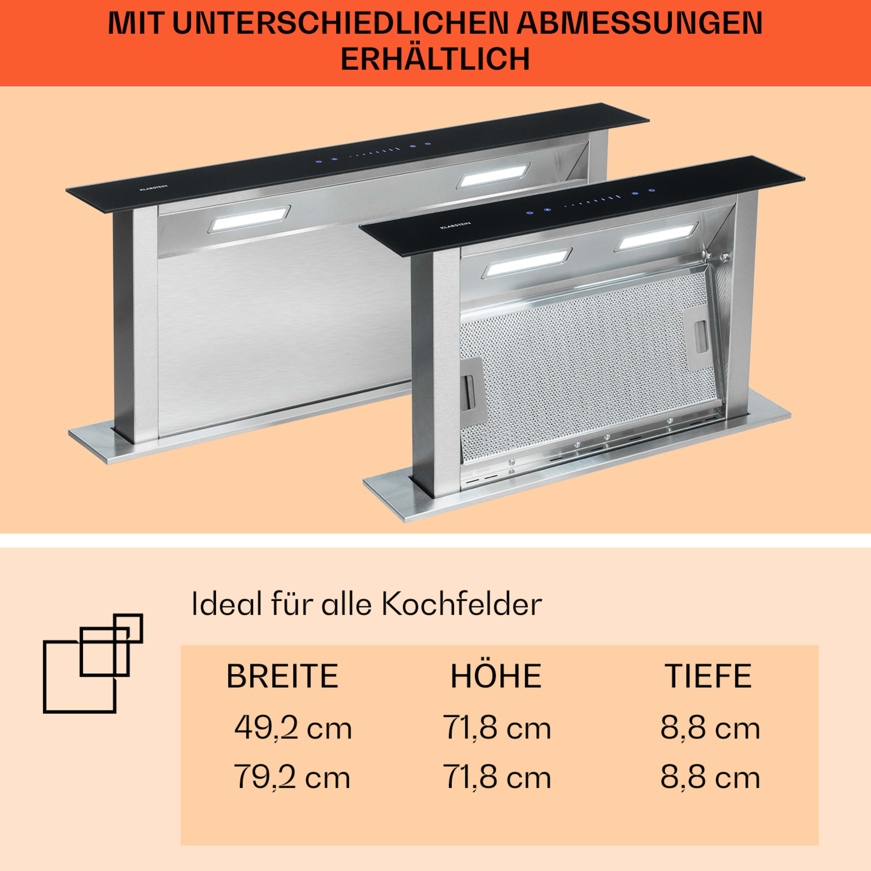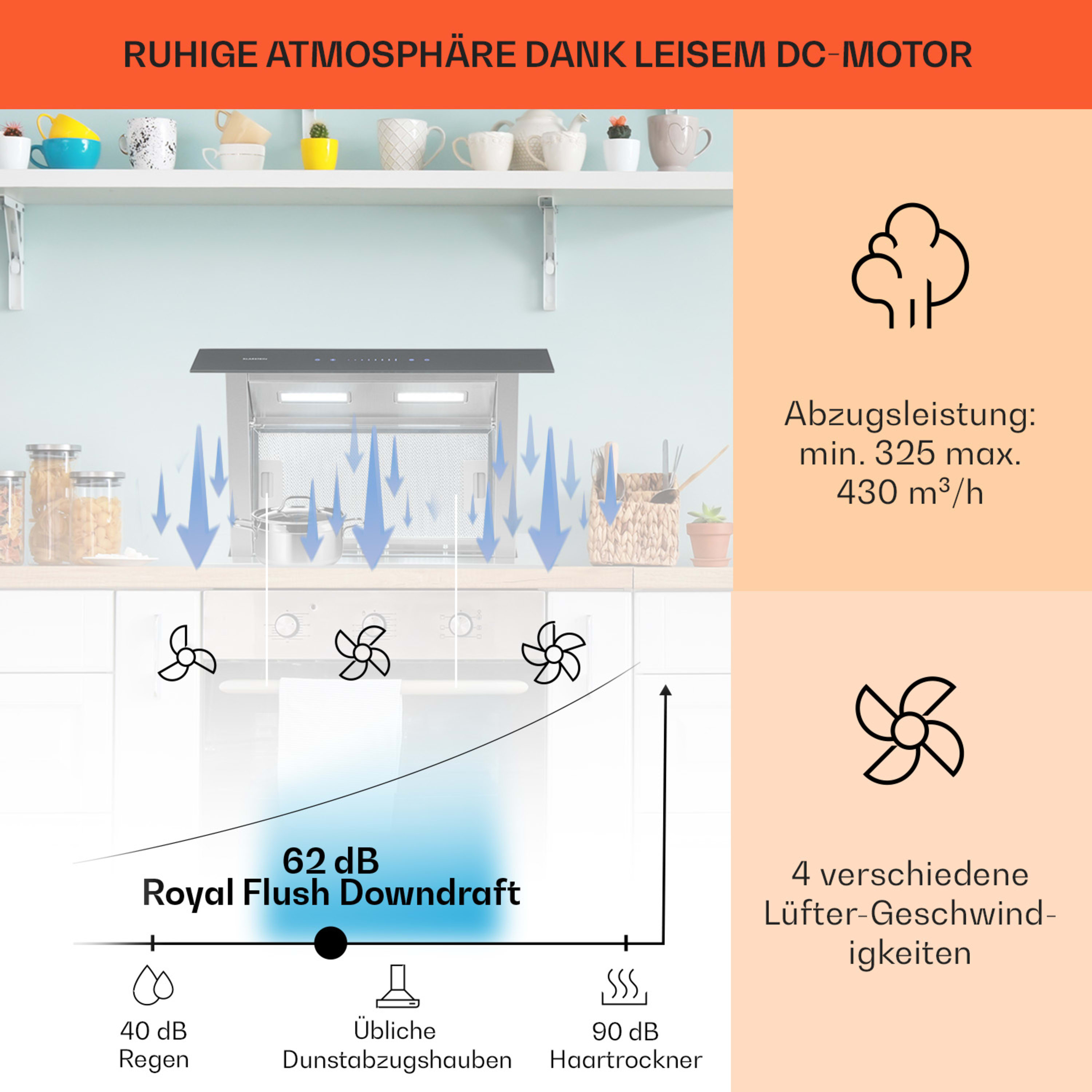 Downdraft-Abzugshauben sind besonders Innovativ und eignen sich für Küchen mit Kochinseln, bei denen der (Luft)Raum frei bleiben soll. Als versenkbare Dunstabzugshaube kann die Klarstein Royal Flush ihr volles Potential in eben solchen Küchen entfalten, macht aber auch in Küchen mit gewohntem Layout eine gute Figur.