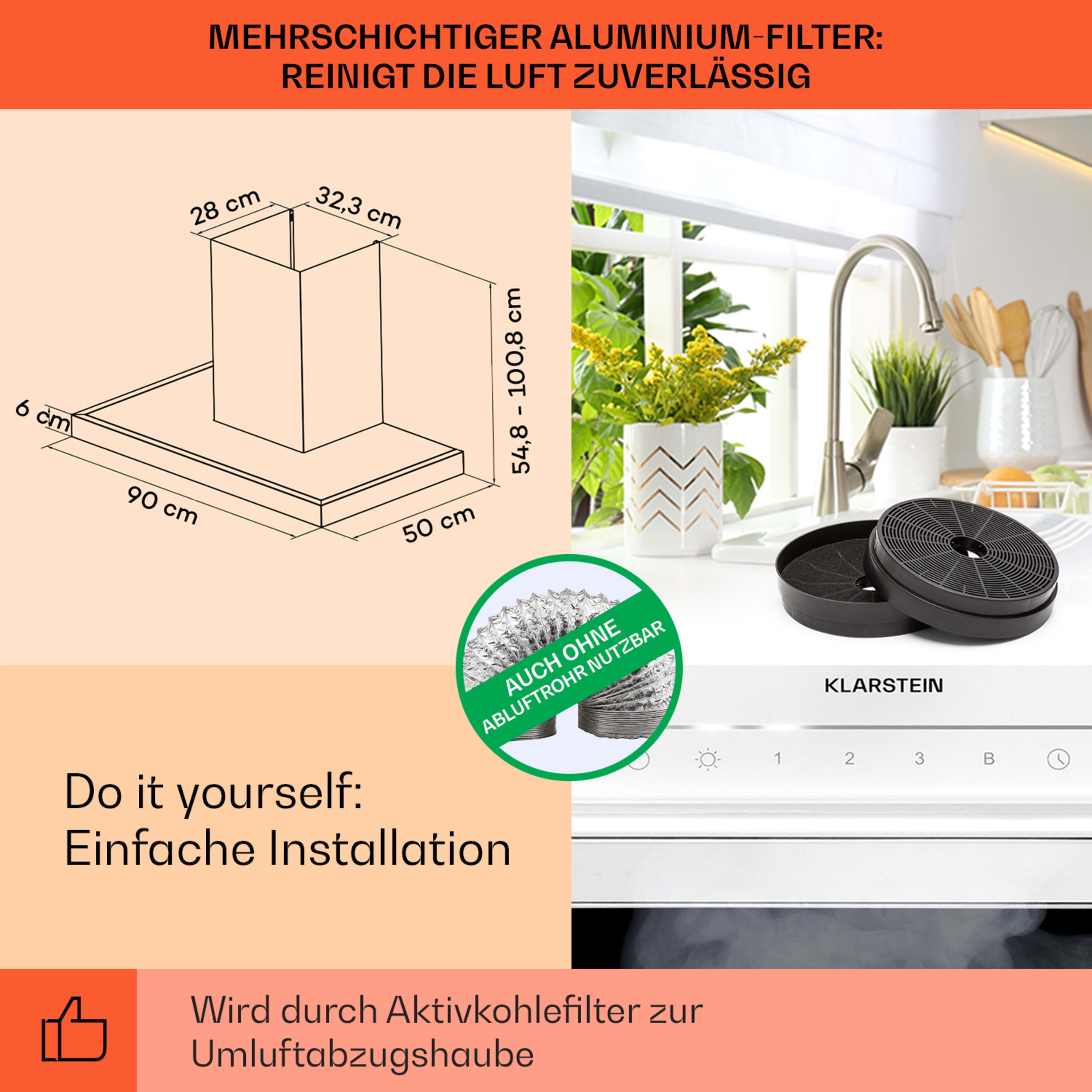 Mit 90 cm Breite ist die Klarstein Alinea Dunstabzugshaube für mittlere und große Kochflächen und Küchenzeilen bestens geeignet. Technisch überzeugt sie nicht nur mit bis zu 500 Kubikmeter Abluftleistung, sondern auch mit ihrer besonders einfachen Bedienung. Unkompliziert funktioniert das entweder über WiFi mit der Klarstein-App oder direkt über die Red Line Touch-Bediensektion an der Frontseite. Hier kannst du nicht nur die drei Ventilationsstufen, eine Hochleistungs-Boosterfunktion oder den Nachlüfttimer auswählen. Sie ermöglicht dir auch, die integrierte LED-Kochflächenbeleuchtung sowohl in Helligkeit als auch Lichtwärme zu steuern.