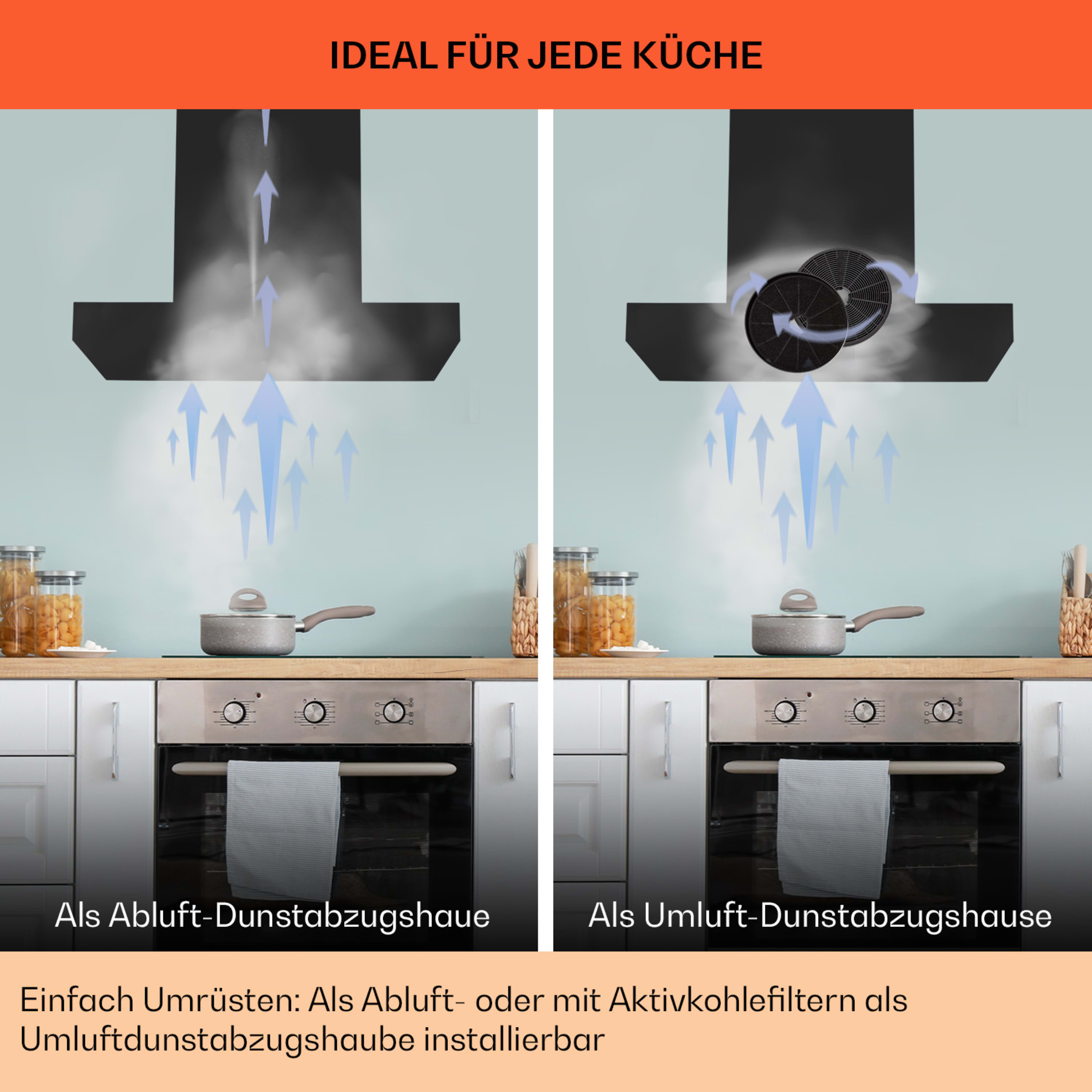 Die Alinea Abzugshaube ist für die Installation an der Wand vorgesehen, das notwendige Montagematerial sowie Verblendungen für den Abluftschlauch sind im Lieferumfang enthalten. Die Abzugshaube kann unkompliziert im Umluftbetrieb genutzt werden. Zur Geruchsfilterung sind dafür zwei Aktivkohlefilter direkt enthalten.