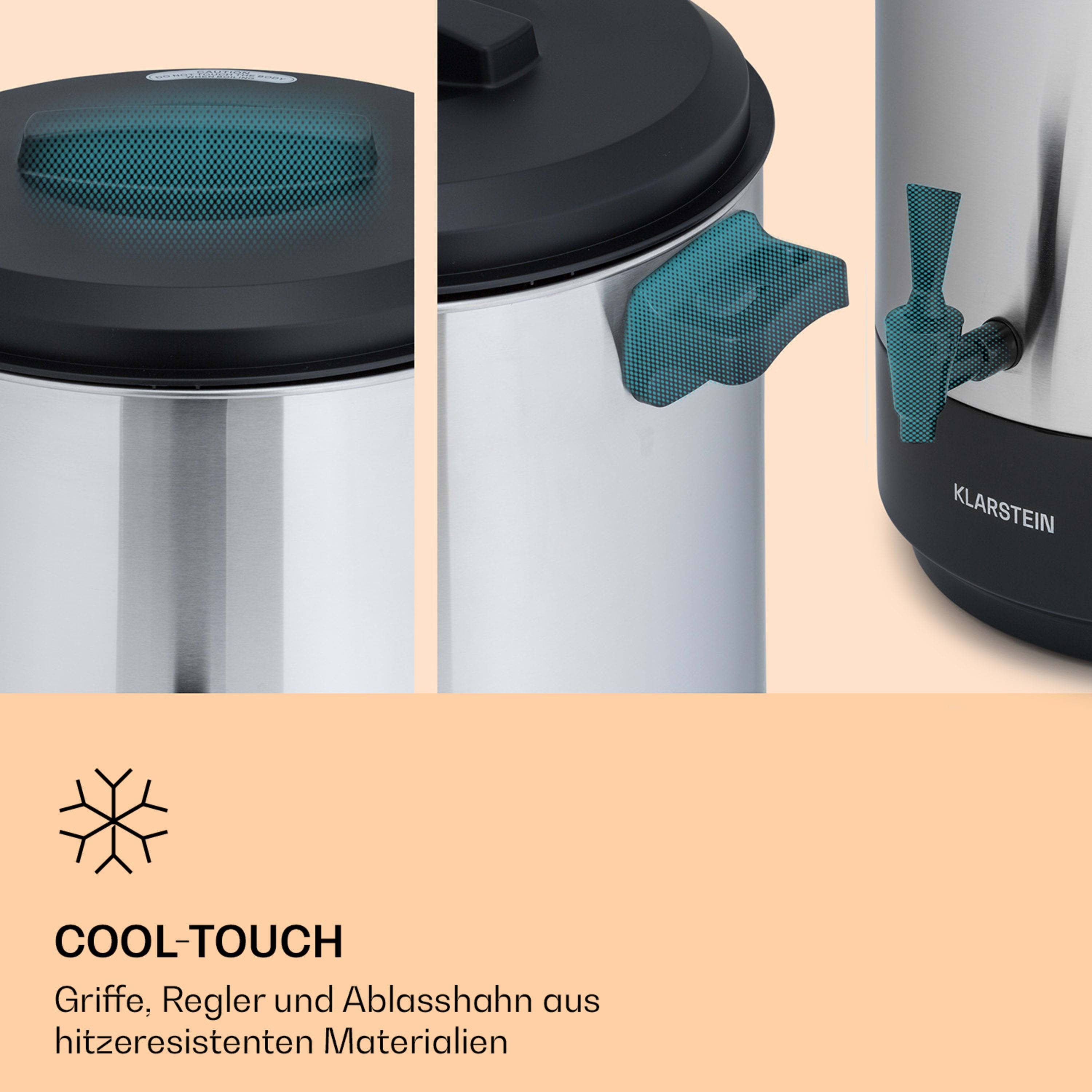 Und mit seinem geschmacksechten und hygienischen Innenleben aus Edelstahl, dem Cool-Touch-Ablasshahn sowie der integrierten Warmhaltefunktion eignet er sich auch vorzüglich als Heißgetränkespender für Tee, Punsch oder Glühwein.