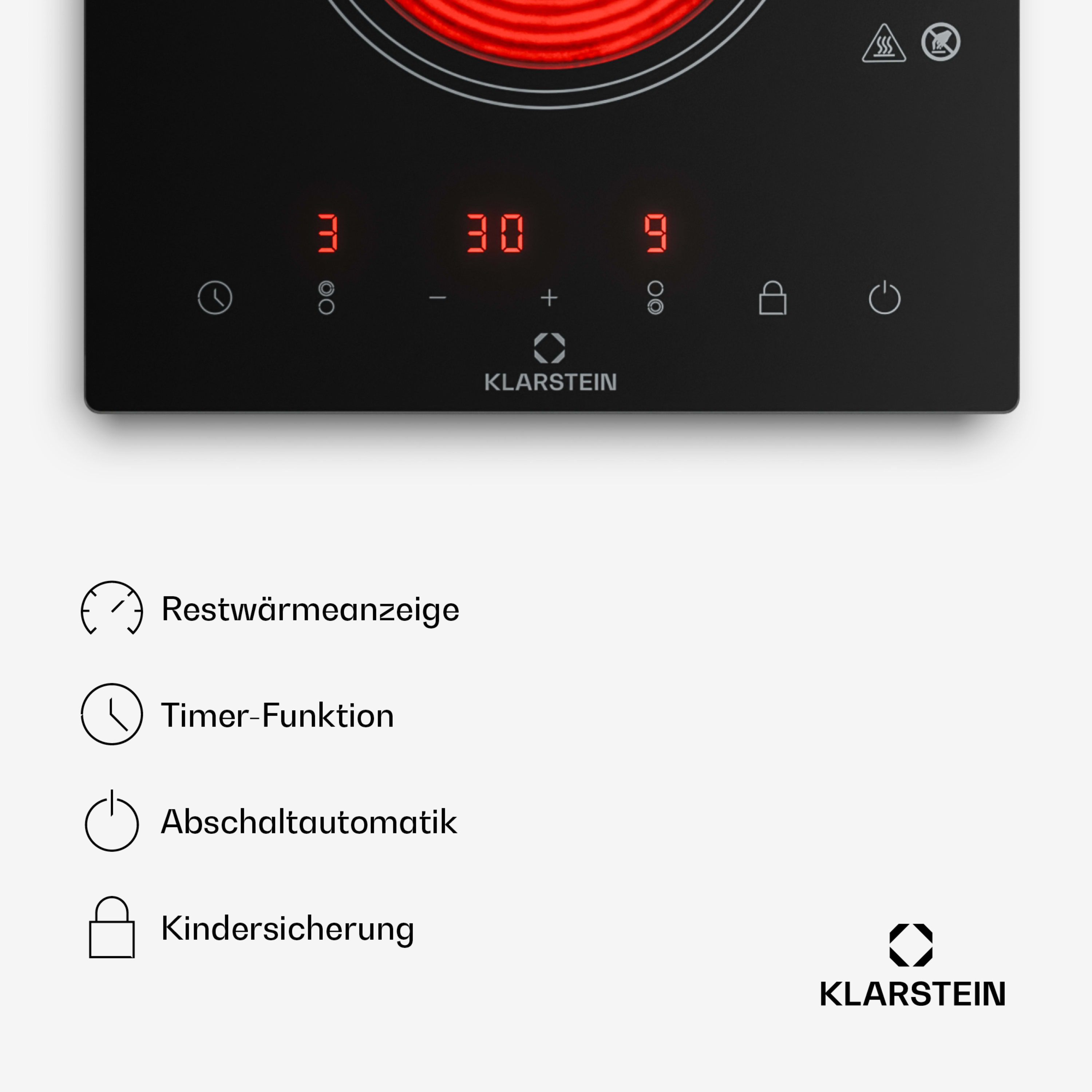 Zwei Kochflächen mit Durchmessern von 16 cm und 20 cm bietet das VariCook Domino Einbaukochfeld, die mit insgesamt 3000 W Leistung die Inhalte von Töpfen und Pfannen zum Kochen bringen. Dabei kann die kleine Platte mit bis zu 1200 W und die große Kochplatte mit bis zu 1800 W Leistung betrieben werden, die in 9 Temperaturstufen separat regelbar sind. Bedient wird das KlarsteinHalogen-Kochfeld über das integrierte Touch-Sensorfeld samt LED-Anzeige. Neben der Temperatur kann für jedes Kochfeld in Minutenschritten ein Timer programmiert werden, der entweder nach Ablauf der eingestellten Zeit die Kochplatte abschaltet oder ein akustisches Signal ertönen lässt.