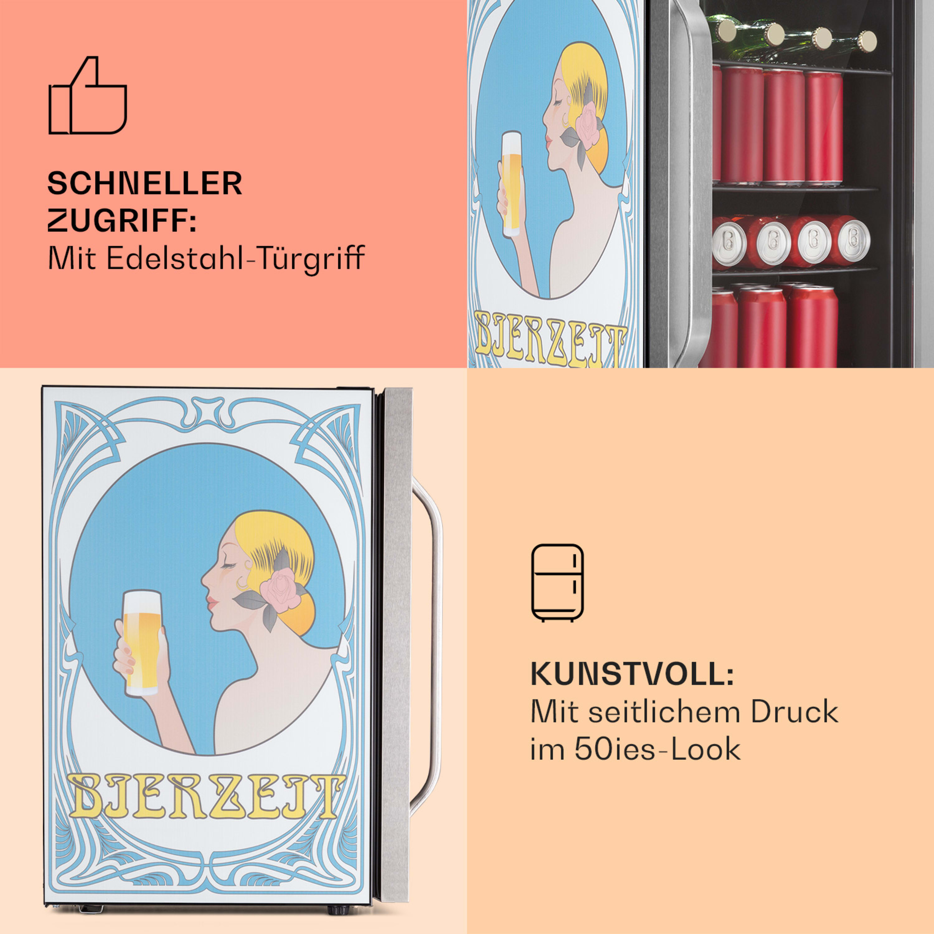 Gut gekühlt erfrischt besser: Der Klarstein Beersafe 70 ist ein kompakter Getränkekühlschrank mit Glastür und einem Fassungsvermögen von 70 Litern. In der spritzigen Bierzeit Edition erfrischt er seine Umgebung mit einem kühlenden Bierzeit-Print und verleiht Küche oder Hobbyraum das Extra an Flair.