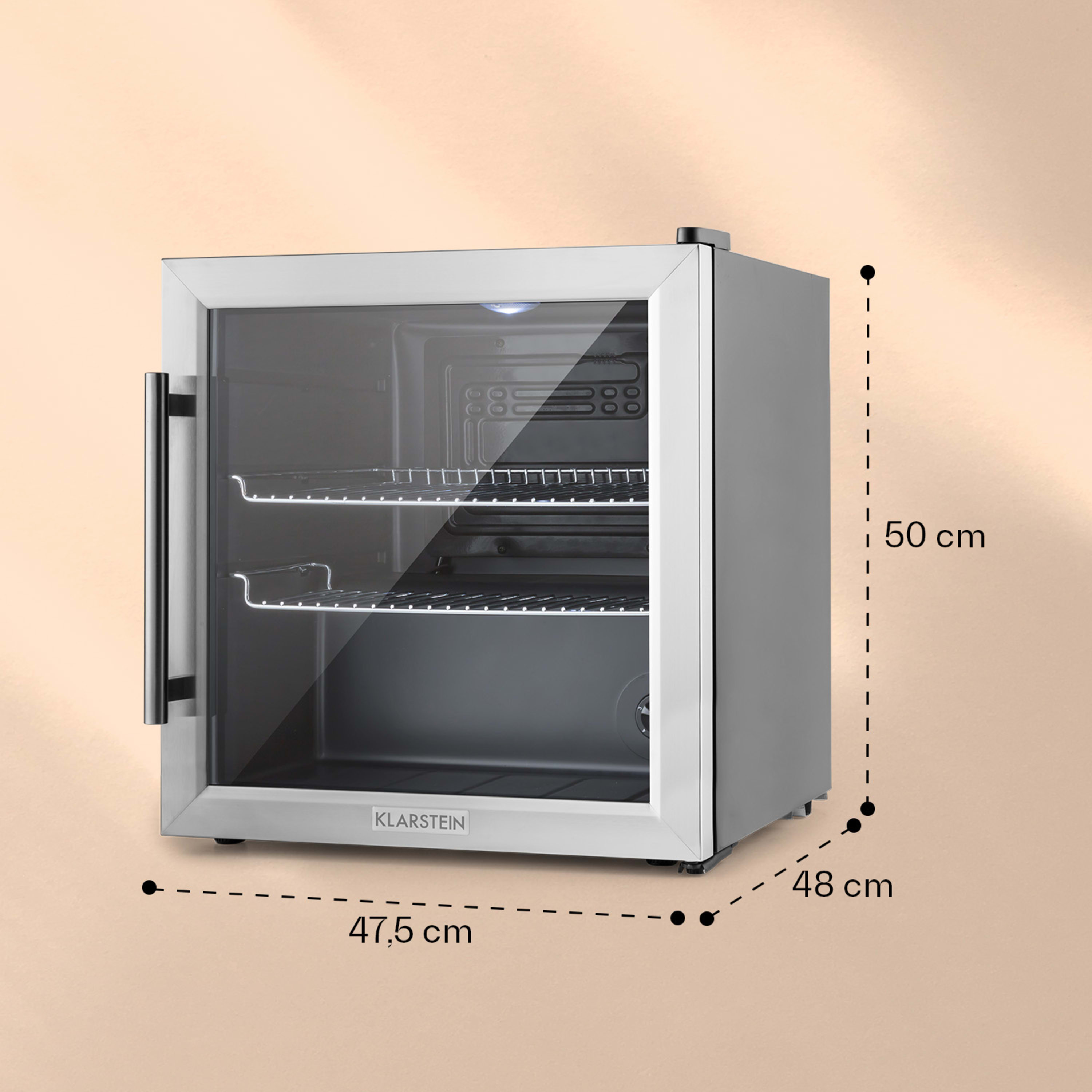 Kompakter, aber sehr geräumiger Kühlschrank, den ich für mein Büro gekauft habe, weil ich vor allem im Hinblick auf den Sommer einen kleinen Kühlschrank brauchte, der Wasser und Getränke für mich und meine Kollegen enthalten konnte. Das Design mit dem satinsilberfarbenen Rahmen und Griff sowie die sehr elegante Glastür sind wunderschön und originell! Die Temperatur lässt sich bequem über einen Drehknopf mit 5 Intensitätsstufen regulieren und die Ablagen sind höhenverstellbar, außerdem gibt es einen Schalter für die Innenbeleuchtung. Es ist geräuschlos und kühlt effektiv in kurzer Zeit. Sehr zufrieden!