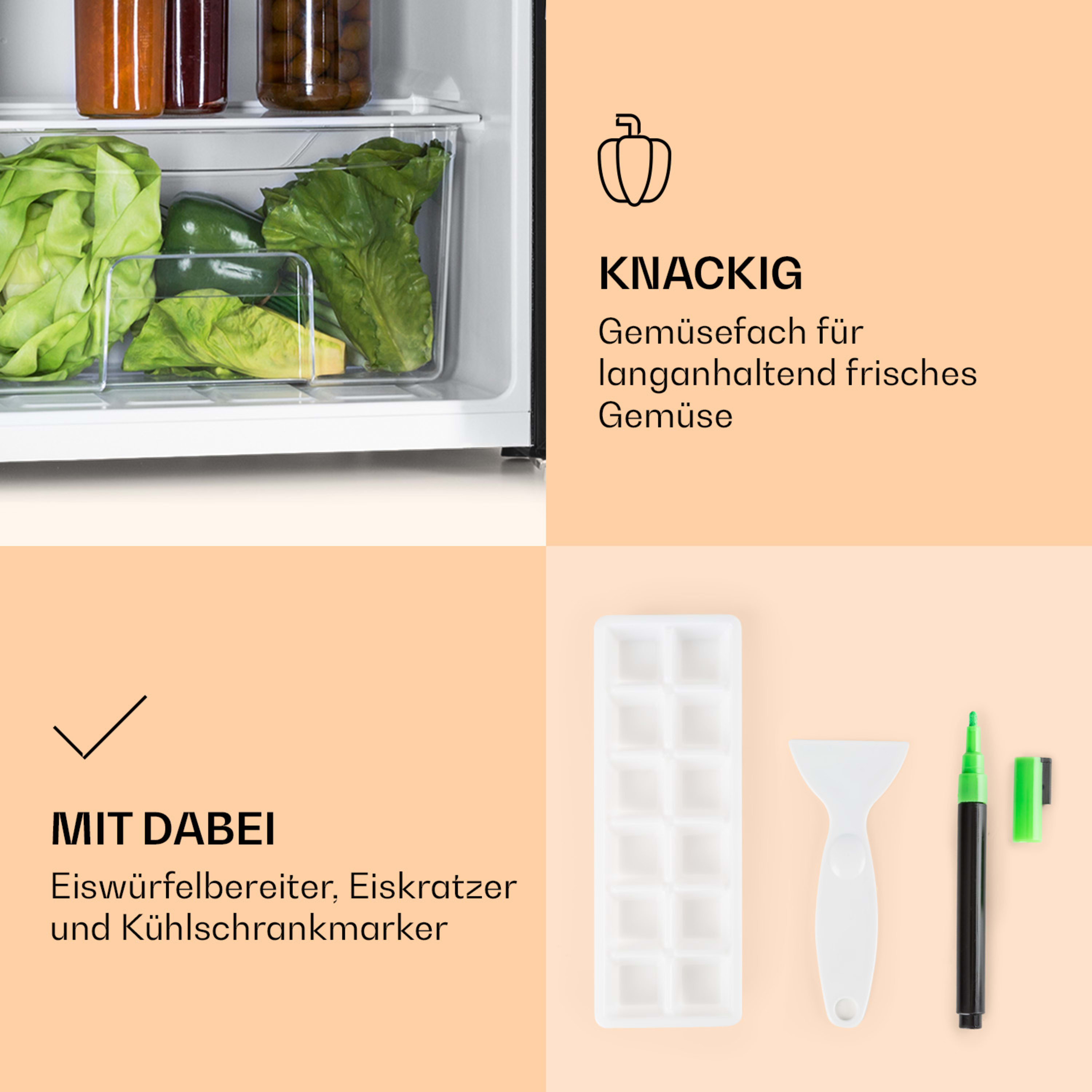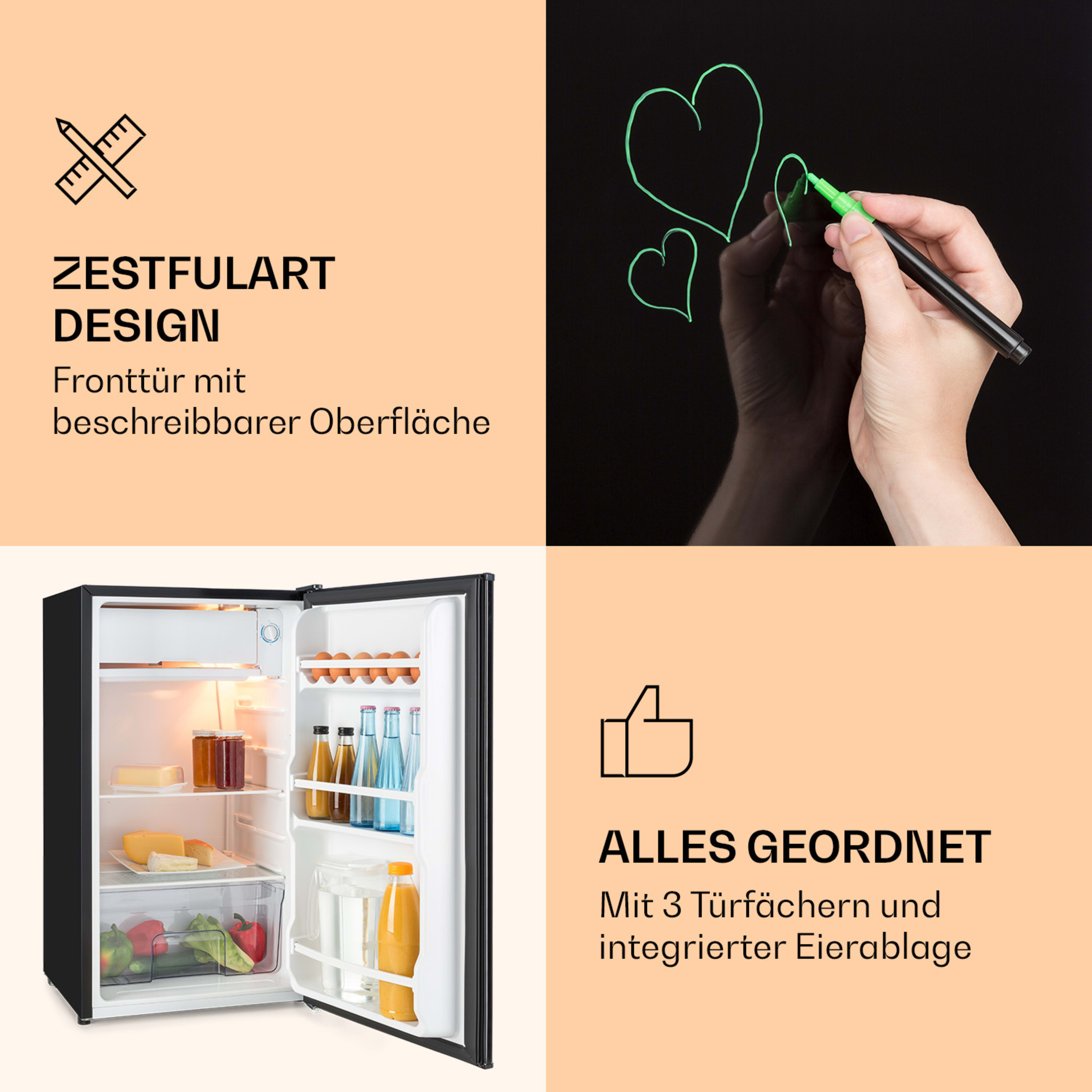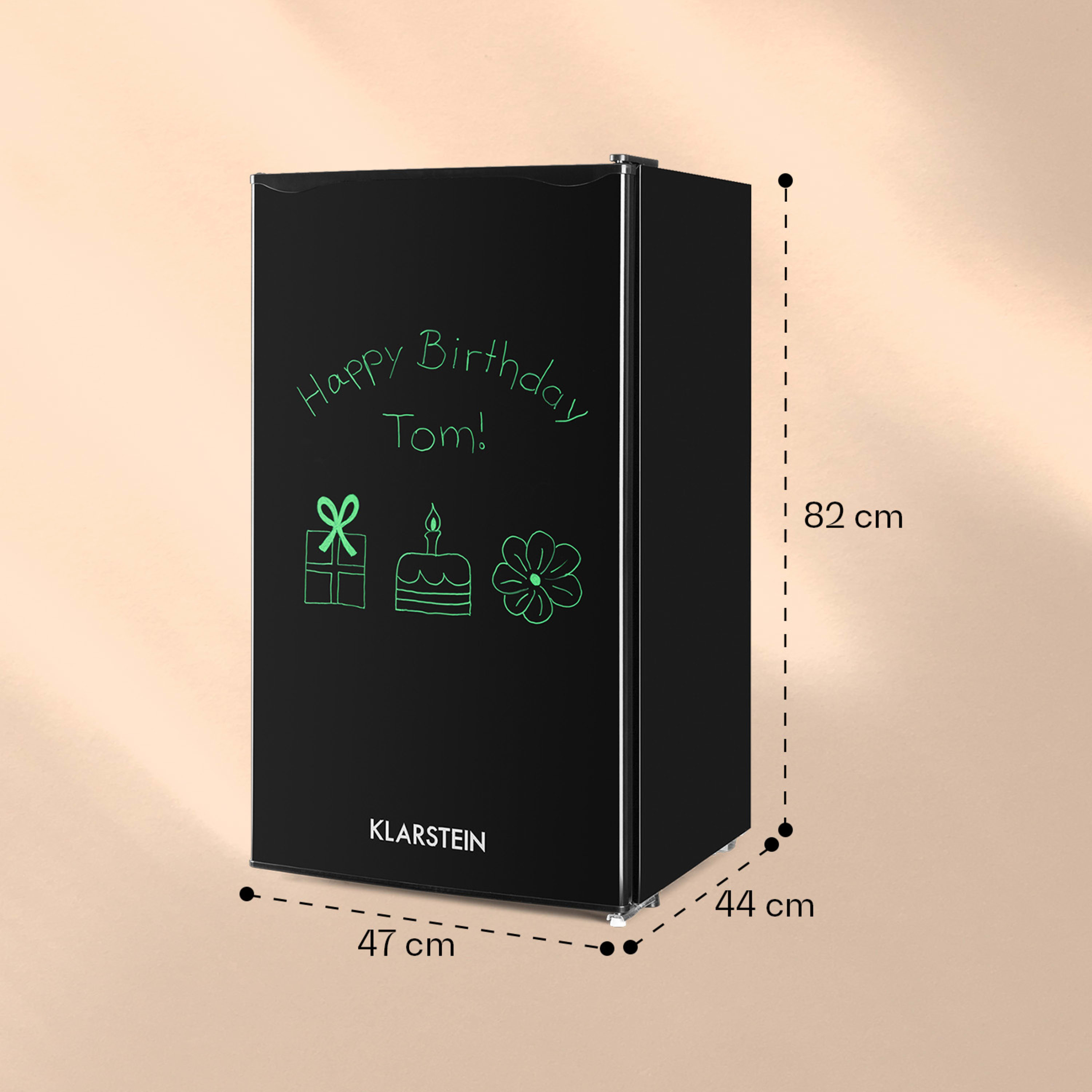 Der Klarstein Spitzbergen Uni ist nicht nur ein Kühlschrank, seine Front-Oberfläche ist wie ein White Board mit geeigneten Markern beschreib- und wieder abwischbar. Sie bietet viel Platz für Einkaufslisten, Notizen oder sogar Liebesbotschaften. Sein geräumiges Kühlfach mit 81 Litern Volumen und das topseitige Gefrierabteil mit 10 Litern bieten viel Platz für deine Lebensmittel. Für Ordnung sorgen zwei Einlegeböden, 3 Türfächer und ein Gemüsefach. Über einen 5-stufigen Drehregler kannst du die Temperatur individuell einstellen.
