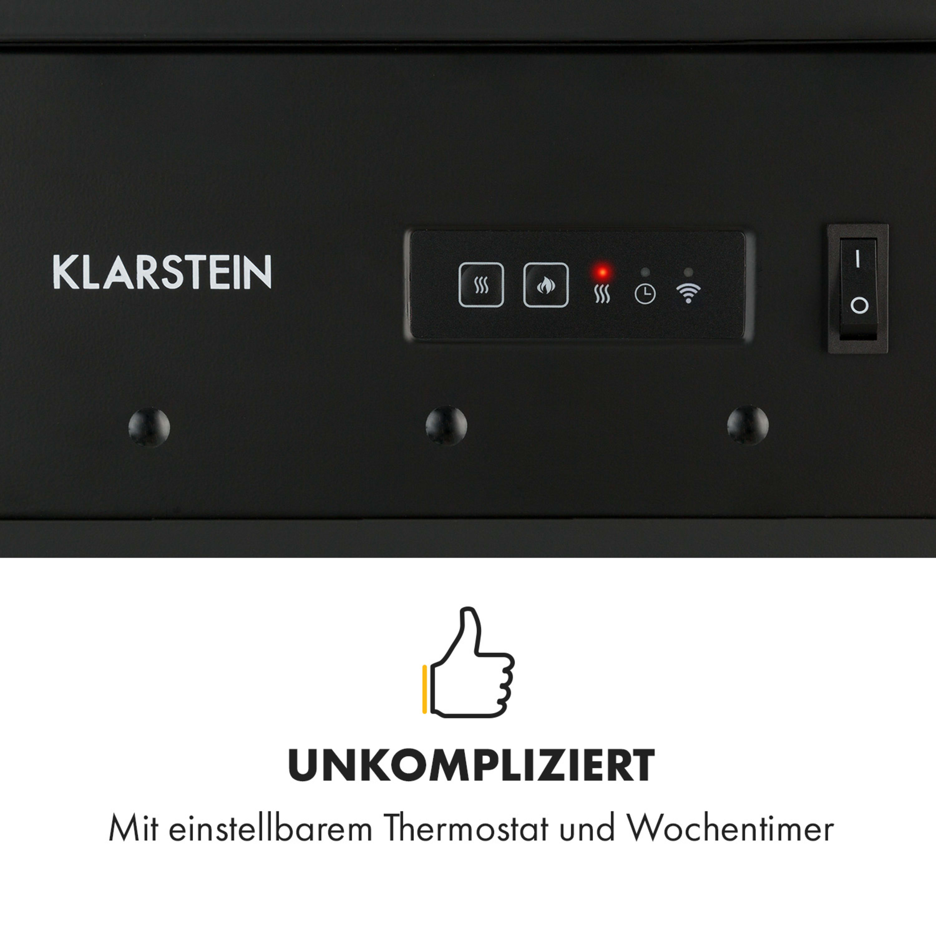 Auf Wunsch kannst du die Heizung zuschalten, welche sofort Wärme verbreitet und wahlweise mit 950 oder 1900 Watt betrieben wird. Die Bedienung ist einfach, zusätzlich zu den Schaltern am Gerät selbst kann der Kamin mit der beiliegenden Fernbedienung komfortabel gesteuert werden. Ein weiteres Upgrade für dein unkompliziertes, wohlig warmes Heizerlebnis bietet dir der Wochentimer und die Klarstein App Experience: Steuere ein oder mehrere Heizgeräte ganz einfach per Smartphone oder Tablet. Ein besonderes Highlight ist auch der dekorative Stauraum für Holzscheite im Fuß des Kamins.