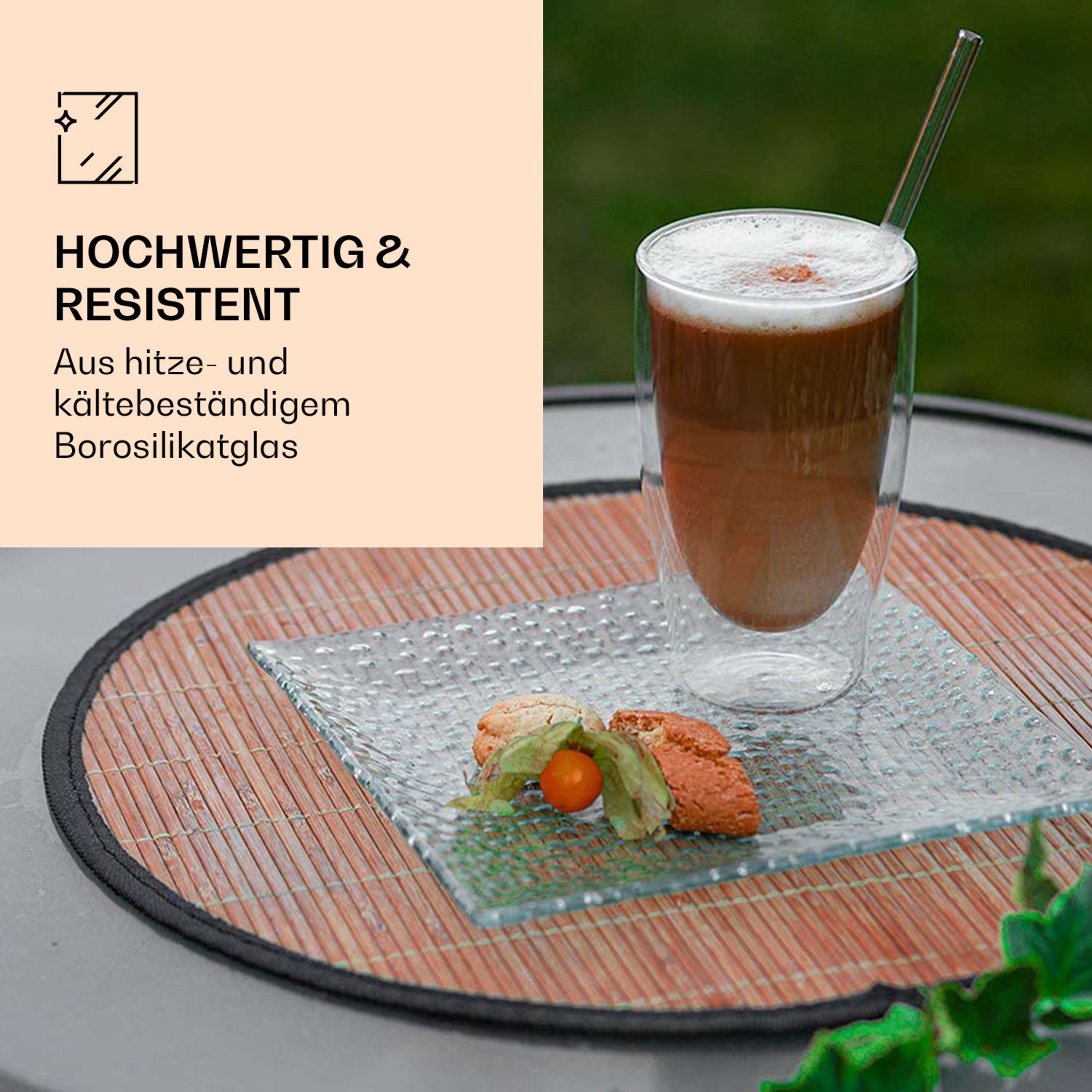 Perfekte Begleiter für stilvollen Genuss Ein entscheidender Aspekt, der mich von Anfang an beeindruckt hat, ist die doppelwandige Konstruktion der Gläser. Diese sorgt dafür, dass meine Heißgetränke länger warm bleiben, während die äußere Wand des Glases angenehm kühl bleibt. Egal ob Latte Macchiato, Cappuccino, Tee oder Eiskaffee - ich kann mein Getränk in vollen Zügen genießen, ohne mir Gedanken über die Temperatur machen zu müssen. Die Gläser sind auch für kalte Getränke geeignet und halten sie schön kühl, ohne dass sich Kondensation bildet. Die Größe der Gläser ist ebenfalls optimal. Mit einem Fassungsvermögen von 400 ml bieten sie ausreichend Platz für eine großzügige Portion meines Lieblingsgetränks. Es ist ein wahrer Genuss, den herrlichen Schaum meines Latte Macchiatos oder Cappuccinos in diesen Gläsern zu bewundern. Die Höhe der Gläser ist perfekt, um die Schichten eines Latte Macchiatos oder die Kaffee- und Milchverhältnisse eines Cappuccinos zu präsentieren. Die Qualität des Glases selbst ist hervorragend. Es ist klar und transparent, was es ermöglicht, die verschiedenen Schichten meines Kaffeegetränks zu betrachten und die Farben und Texturen zu bewundern. Das Glas fühlt sich zudem robust und stabil an, was auf eine lange Haltbarkeit hinweist.