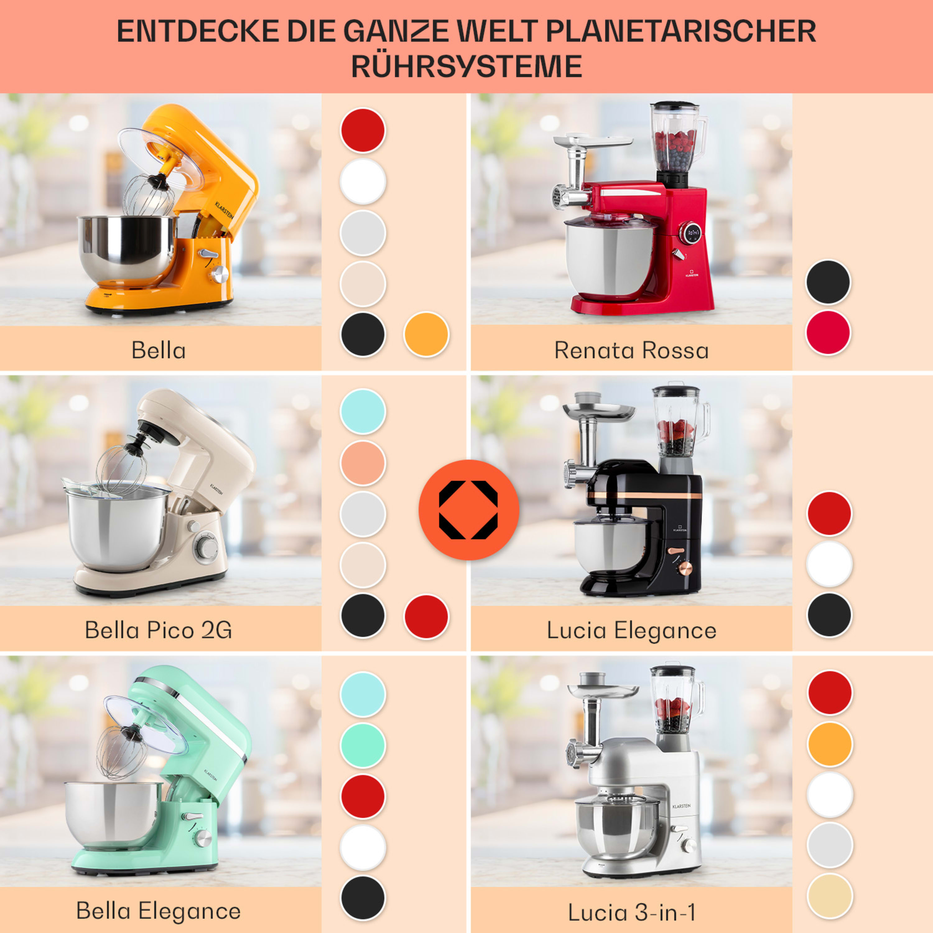 Kraftvoll und kompakt: Stilvolles Rühren, Kneten oder Aufschlagen ist mit der Klarstein Bella Pico 2G Küchenmaschine ganz einfach. Mit 1300 Watt, 6 Leistungsstufen und unserem planetarischen Rührsystem meisterst du alle Herausforderungen der modernen Rührkunst. In der 5 Liter großen Edelstahlrührschüssel finden alle Zutaten perfekt gemischt zusammen. Die kompakten Maße und das farbenfrohe Design runden das Gesamtpaket ideal ab.