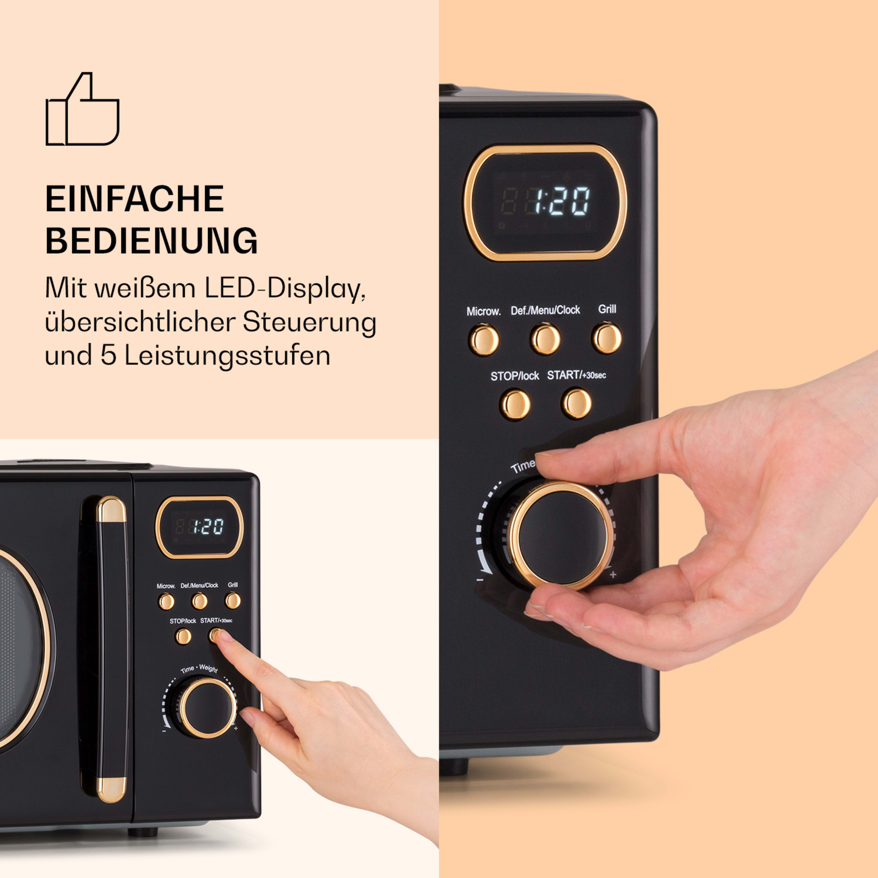 - 5 Leistungsstufen für die Mikrowelle: Low, Medium Low (Auftauen), Medium, Medium High, High