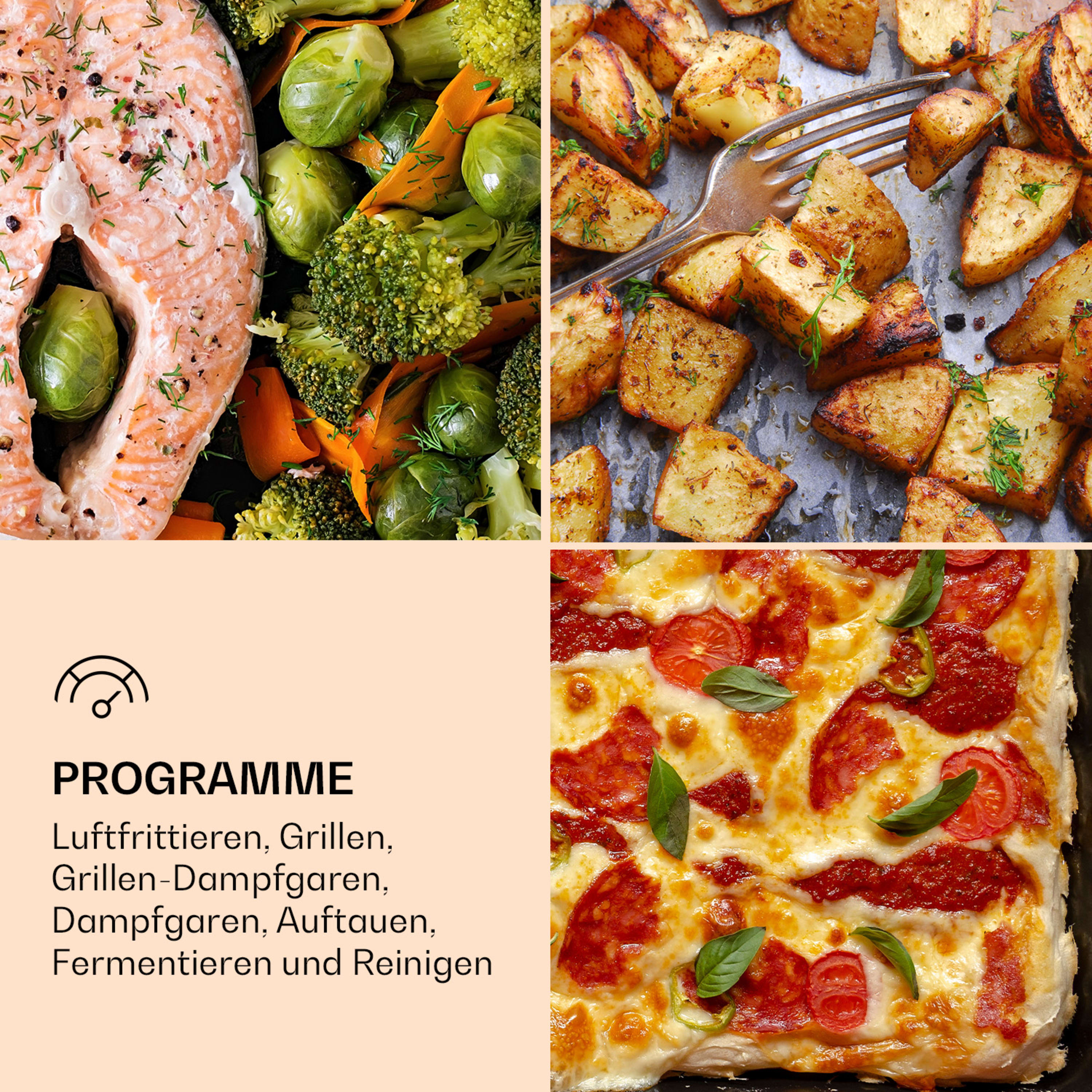 - Programme: Luftfrittieren, Grillen, Grillen-Dampfgaren, Dampfgaren, Auftauen, Fermentieren und Reinigen