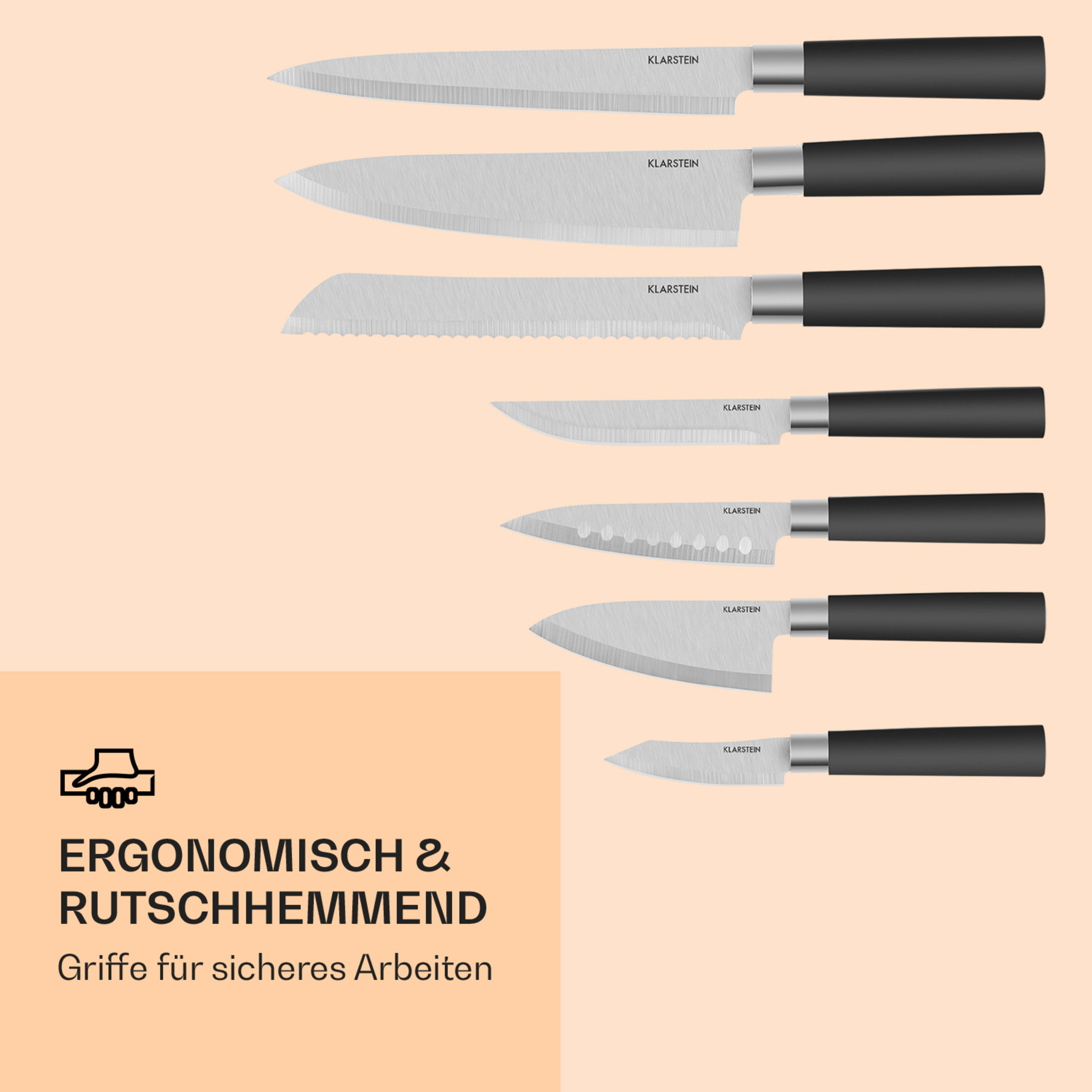 Klinge und Schärfe im Einklang - Das 8-teilige Messerset Klarstein Kitano vereint japanische Kochkunst mit der Präzision gehärteten Klingenstahls für schnittfeinen Kochgenuss.