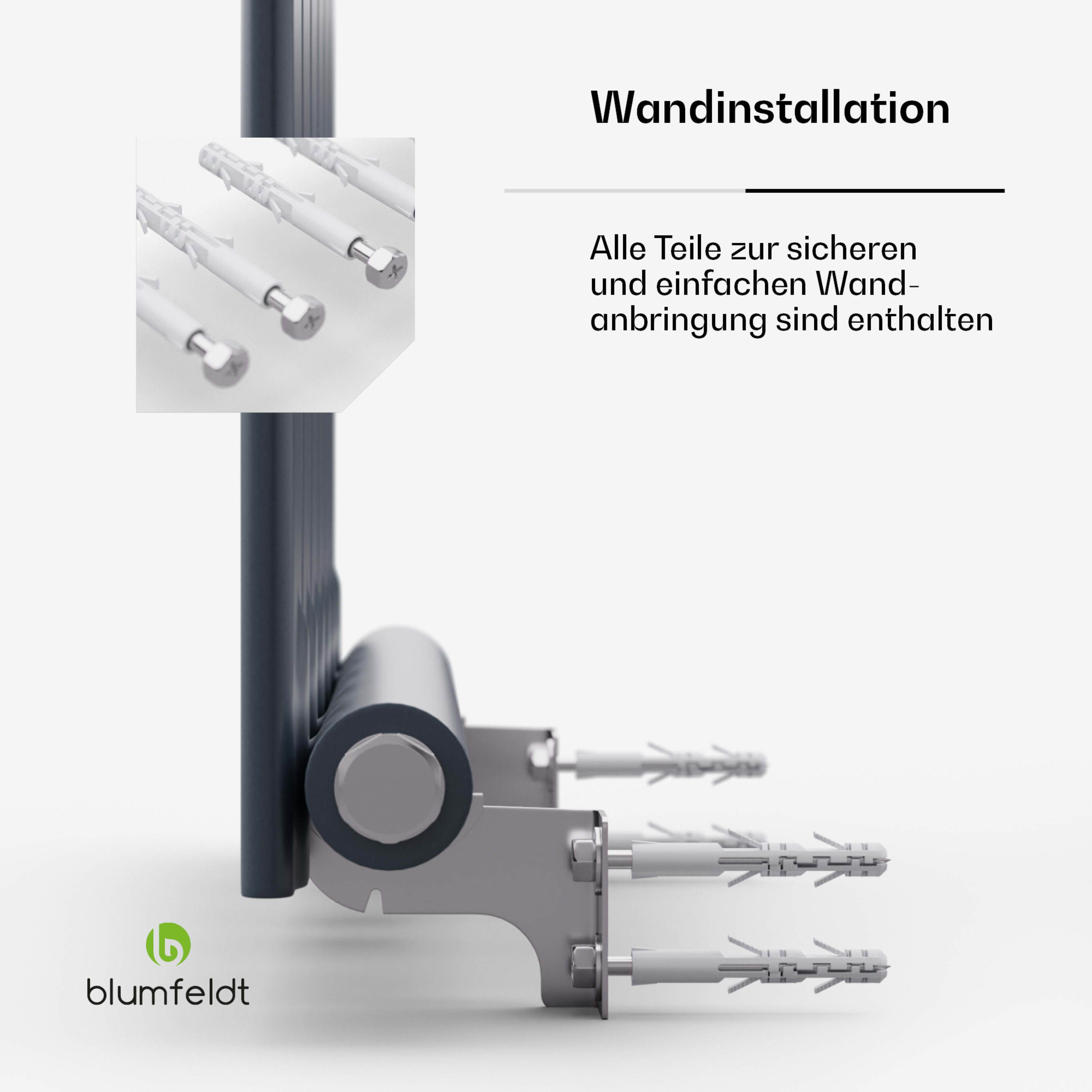 Der blumfeldt Ontario 45 × 180 Röhrenheizkörper integriert sich ganz umstandslos in ein vorhandenes Warmwasser- oder Fernwärmeheizsystem und arbeitet auch mit elektrischen Heizstab- oder elektronischen Thermostatsystemen. Dabei spendet er zuverlässige und gleichmäßige Wärme in kleinen bis mittelgroßen Räumen. Der Anschluss an den seitlichen Röhren ist denkbar einfach. Auch die notwendigen Wandhalterungen sind direkt im Lieferumfang enthalten. Das stabile Röhrensystem aus Metall leitet und verteilt dabei optimal die Wärme im Raum. Die vertikalen Heizröhren sind durch Zwischenabstände sehr einfach zu reinigen und bieten eine ideale Möglichkeit, deine Handtücher kuschelig zu wärmen und zu trocknen. Dank des besonderen Slim-Designs passt er perfekt in alle Räume mit begrenztem Platzangebot.