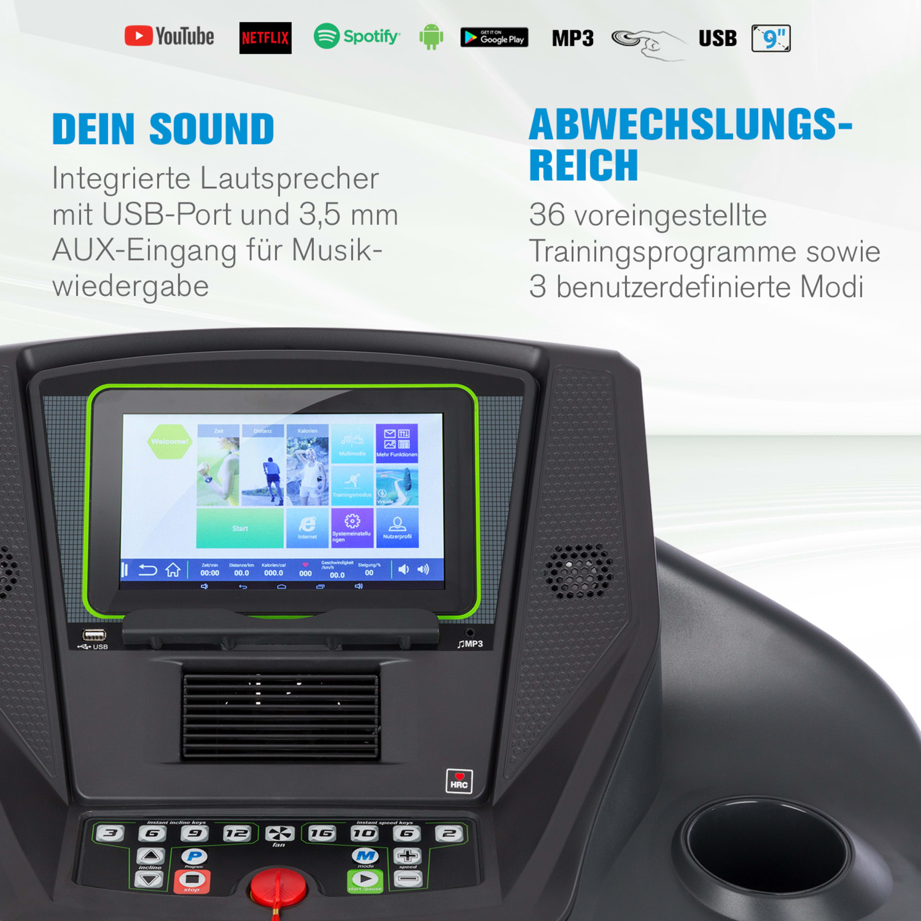 Willkommen im multimedialen und konnektiven Training der Zukunft: Dank seinem integrierten 9" TFT-Touch-Screen mit WiFi-Verbindung eröffnet das CAPITAL SPORTS Infinity Track 6.0 Touch Laufband die vollständige Welt des Internets für dein Heimtraining. Du brauchst optische Reize für deinen Lauf? Kein Problem, greif einfach via Internet auf tausende Videos realer Laufstrecken, z.B. bei Kinomap, zu und erkunde sie in deinem Training. Oder du verbindest dich mit einer der zahlreichen Mediadatenbanken, wie Netflix, YouTube oder Spotify für Filme, Videos, Bücher oder Musik und gestaltest dein Multimedia-Training genau nach deinen Wünschen. Natürlich besitzt der Mini-Computer auch die Möglichkeit, deine Trainingsergebnisse direkt auf deinem Facebook-Account zu teilen. Oder du surfst einfach durch das Internet - soviel Abwechslung beim Joggen hattest du noch nie. Besonders praktisch: Über den ebenfalls vorhandenen USB-Port oder per 3,5-mm-AUX-Eingang kannst du die die integrierten Lautsprecher mit deiner Wunschmusik versorgen und deinem Training den passenden Sound verleihen.