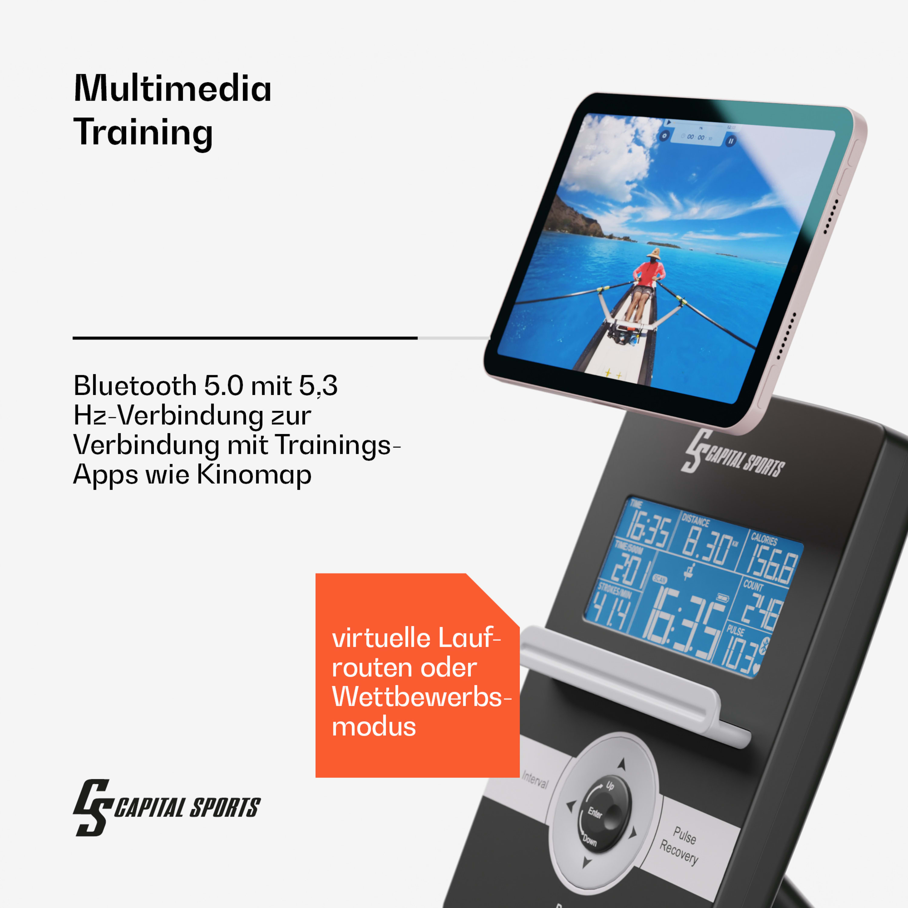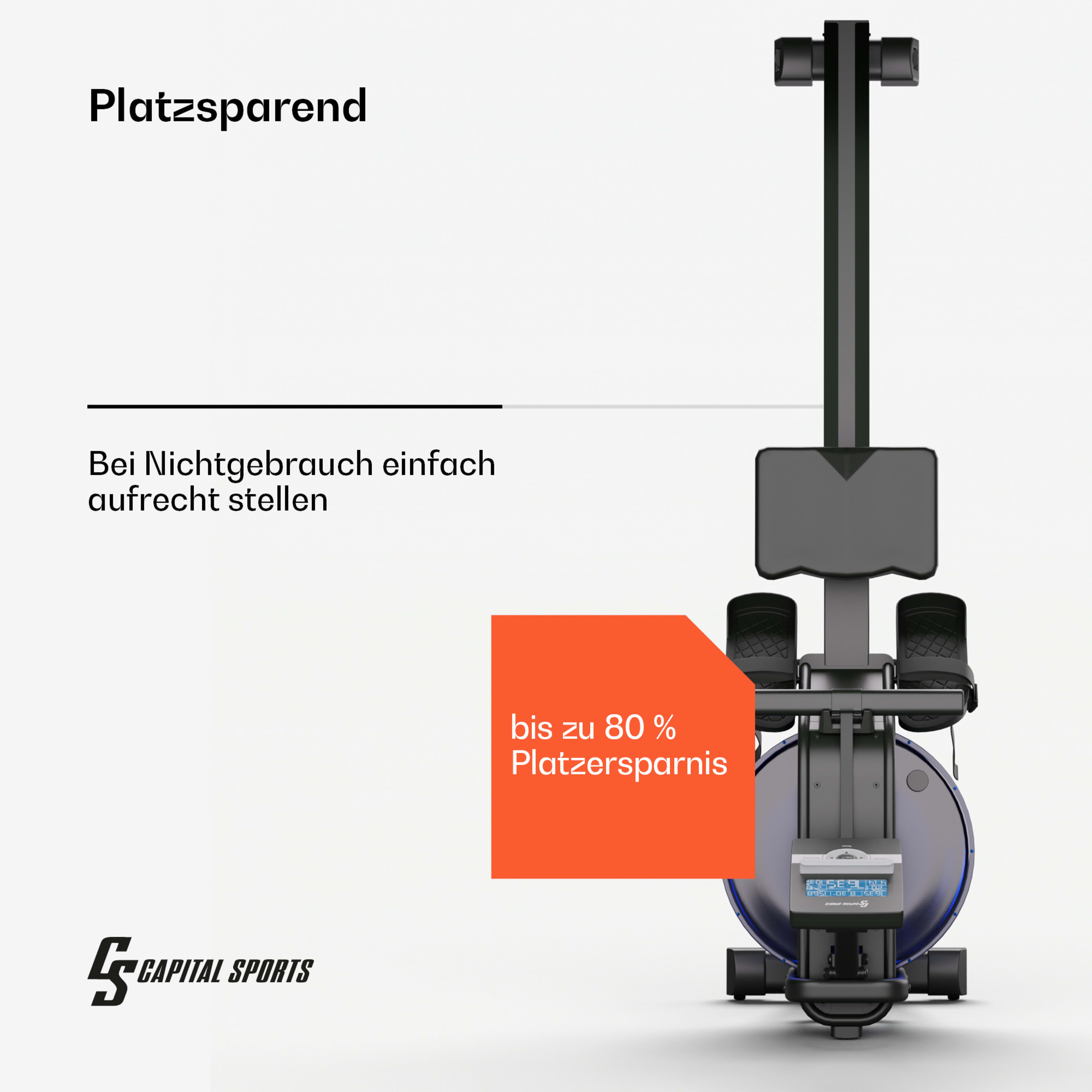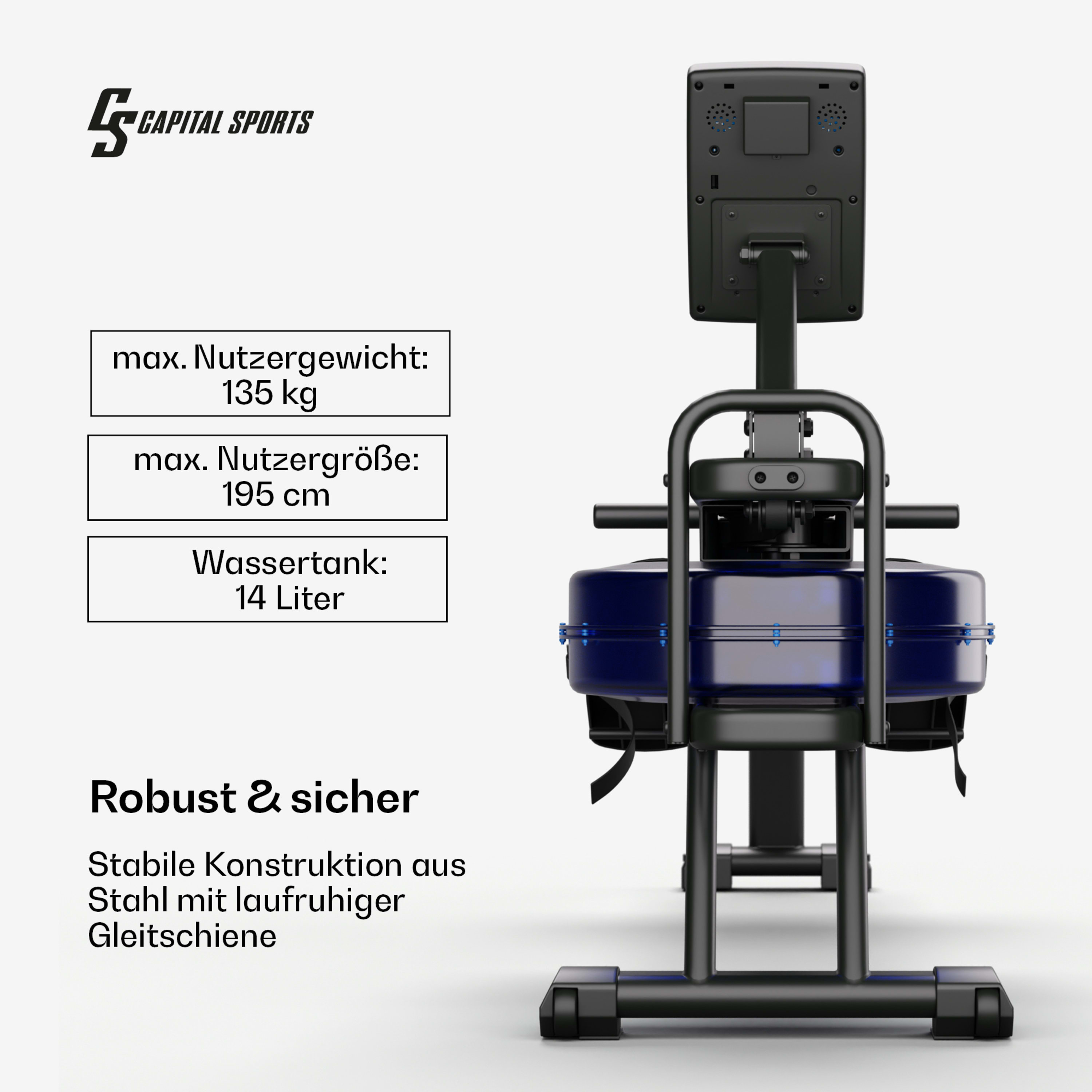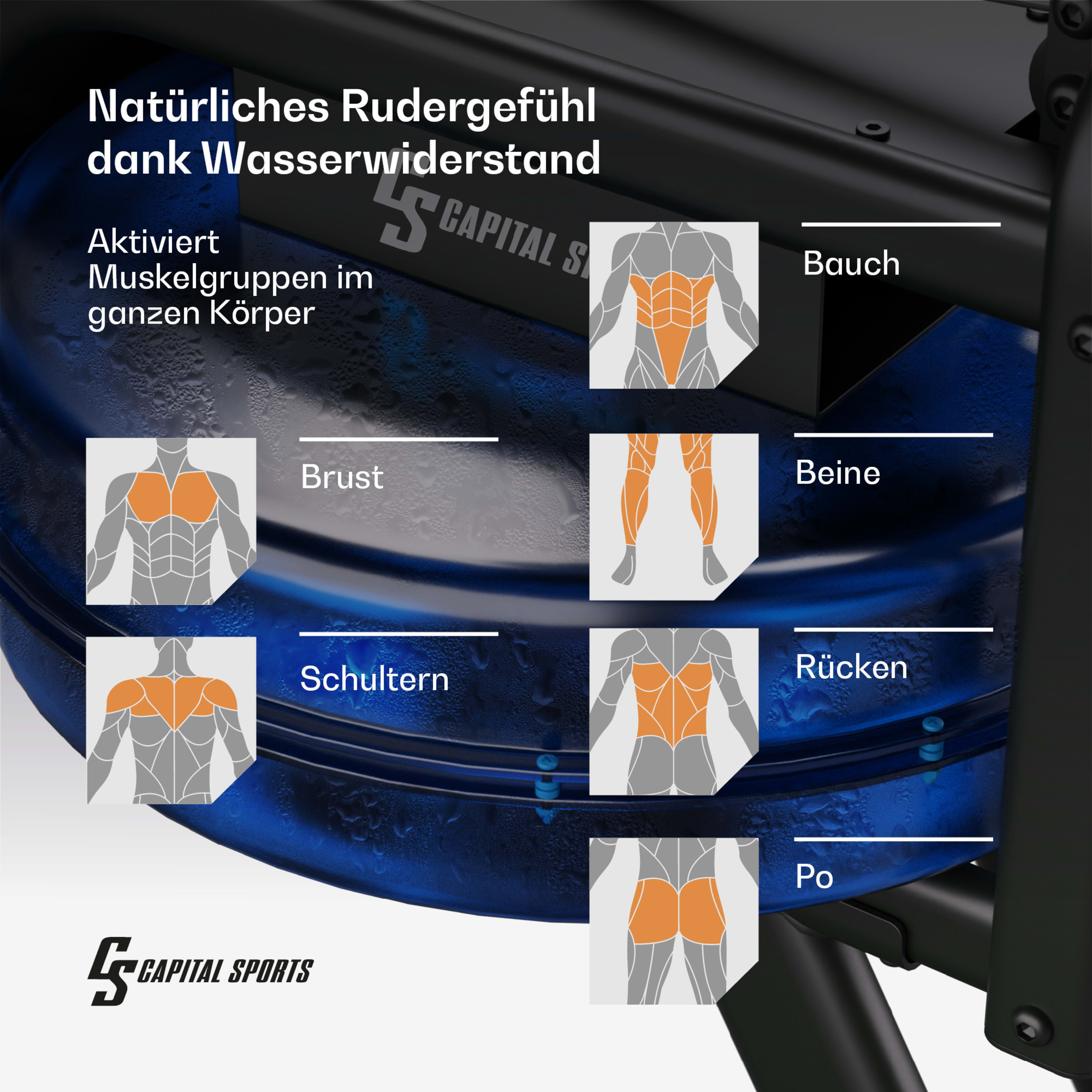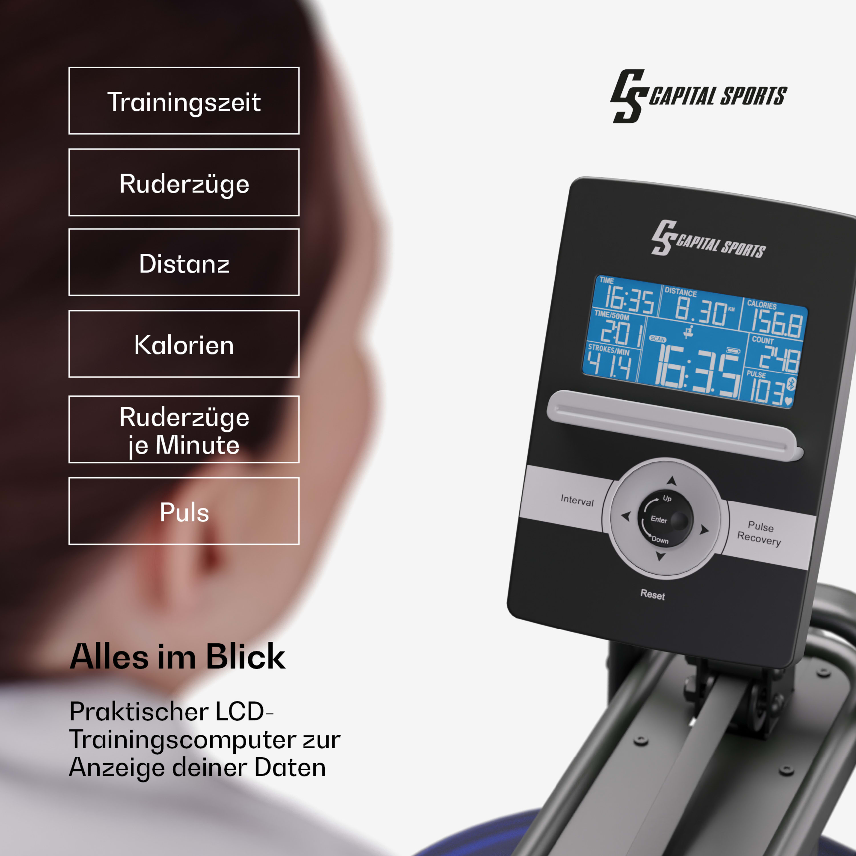 Die CAPITAL SPORTS Oceanus Ruderbank verspricht dir ein einzigartiges Heim-Trainingserlebnis. Herzstück des sehr gleichmäßigen und gelenkschonenden Workouts ist der große 14-Liter-Wassertank, der ein äußerst naturnahes Trainingserlebnis verschafft - fast als würde man tatsächlich über einen See rudern. Wie in einem Ruderboot wird dabei der Trainingswiderstand über die Wassermenge und den eigenen Kraftaufwand reguliert: Je höher der Füllstand des Wassertanks desto höher der Widerstand, als würde man die Ruder möglichst tief eintauchen. Ebenso steigt der Widerstand mit der Stärke des Zugs. Weitere Vorteile des Wasserwiderstands sind das leise Trainingsgeräusch mit dem naturnahen Rudersound sowie die absolute Verschleißfreiheit: Wasser nutzt sich nicht ab! Zur Überwachung deines Trainings besitzt das CAPITAL SPORTS Oceanus Rudergerät einen Minicomputer mit LCD-Display auf dem du immer deine Leistung, zurückgelegte Strecke oder verbrauchte Kalorien einsehen kannst. Der verfügt zusätzlich über eine Bluetooth 5.0 Verbindung, mit der du deine Trainingsdaten an Fitness-Apps wie Kinomap übertragen kannst. Zusammen mit der Halterung für ein Tablet oder Smartphone steht dir so auch die ganze Multimedia-Welt offen für dein Training.